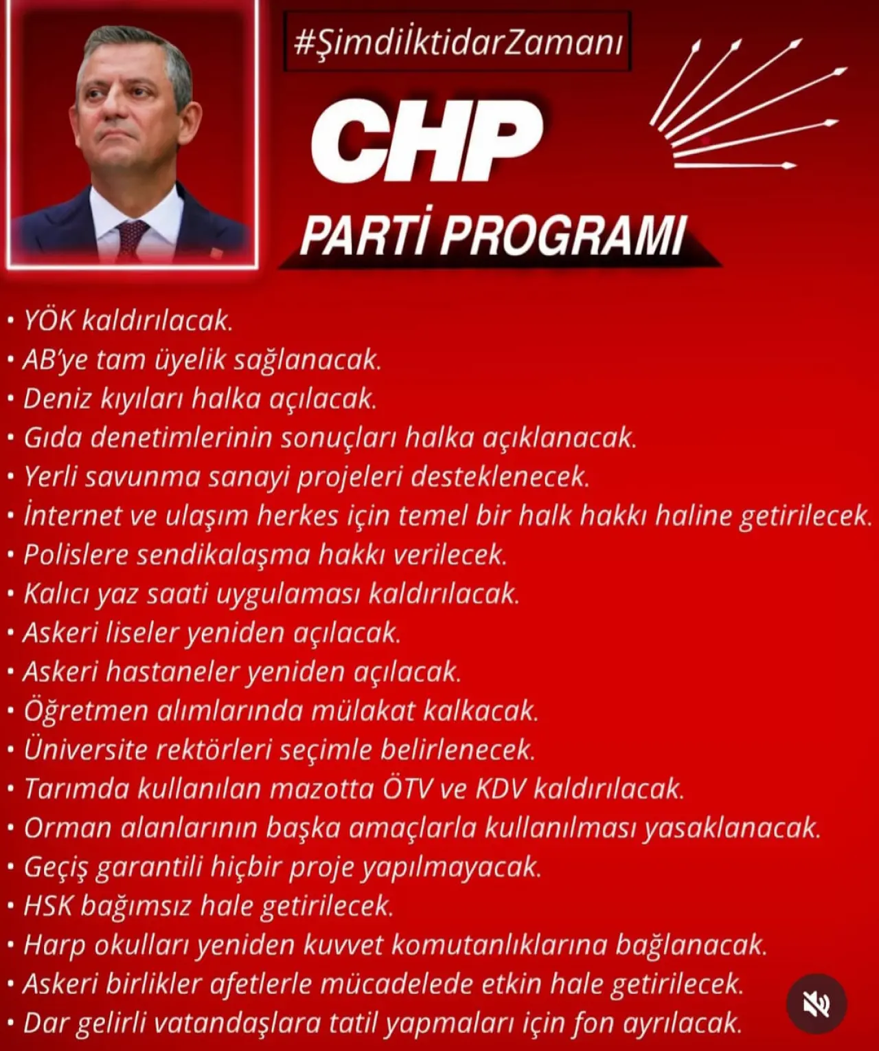 “YÖK kaldırılacak, AB’ye tam üyelik sağlanacak, deniz kıyıları halka açılacak, gıda denetimlerinin sonuçları halka açıklanacak, yerli savunma sanayi projeleri desteklenecek, internet ve ulaşım herkes için temel bir hak hâline getirilecek, polislere sendikalaşma hakkı verilecek, kalıcı yaz saati uygulaması kaldırılacak.