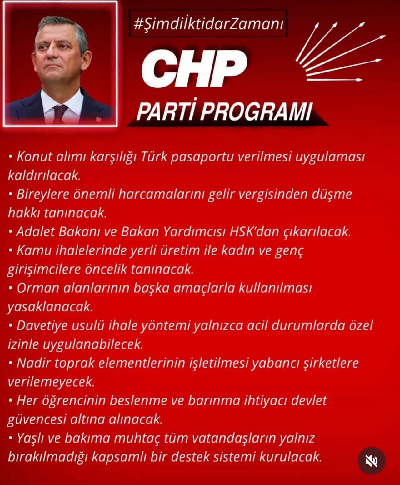 Konut alımının karşılığı olarak Türk pasaportu verilme uygulaması kaldırılacak. Bireylere önemli harcamalarında gelir vergisinden düşme hakkı tanınacak. Adalet Bakanı ve Bakan Yardımcısı HSK’dan çıkarılacak. Kamu ihalelerinde yerli üretim yapan kadın ve genç girişimcilere öncelik tanınacak. Orman alanlarının başka amaçlara kullanılması yasaklanacak. Davetiye usulü ihale yöntemi yalnızca acil durumlarda özel izinle uygulanacak. Nadir toprak elementlerinin işlenmesi yabancı şirketlere verilmeyecek. Her öğrencinin beslenme ve barınma ihtiyacı devlet güvencesi altında olacak. Yaşlı ve bakıma muhtaç tüm vatandaşların yalnız bırakılmadığı kapsamlı bir destek sistemi kurulacak.”