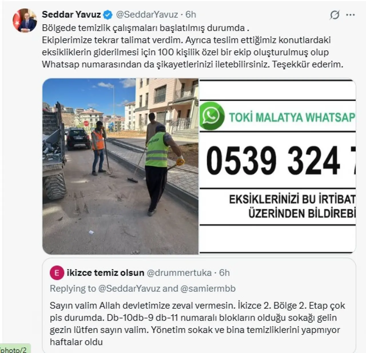 “Bölgede temizlik çalışmaları başlatılmış durumda. Ekiplerimize tekrar talimat verdim. Ayrıca, teslim ettiğiniz konutlardaki eksikliklerin giderilmesi için 100 kişilik özel bir ekip oluşturulmuş olup WhatsApp numaralarından şikâyetlerinizi ve isteklerinizi iletebilirsiniz. Teşekkür ederim.”