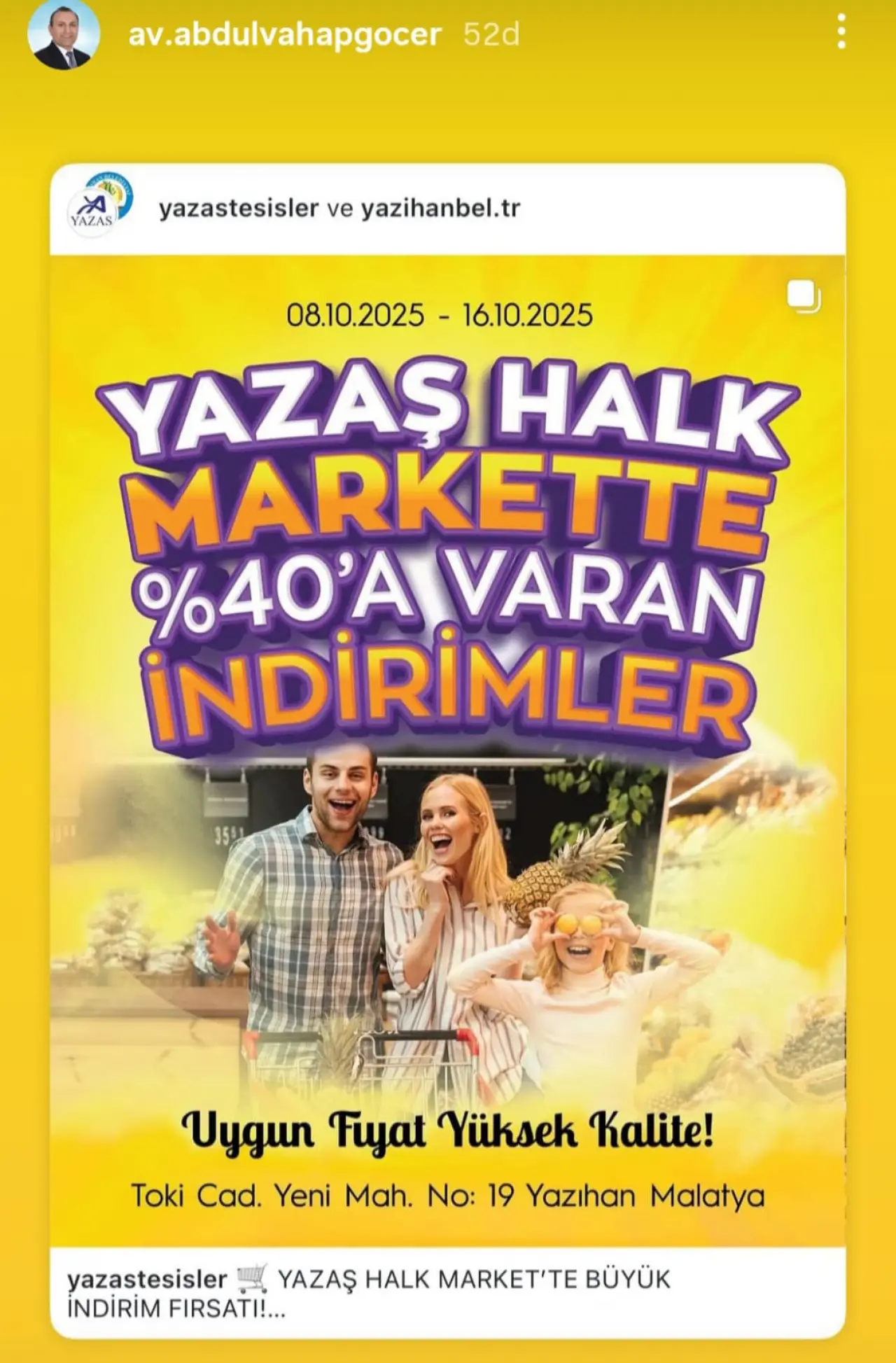 Yazıhan Belediye Başkanı Abdullah Göçer, sosyal medya hesabından yaptığı açıklamayla YAZAŞ Halk Marketlerinde %40’a varan indirim kampanyasının başladığını duyurdu. “Uygun fiyat, yüksek kalite” anlayışıyla hizmete giren market, ilçedeki vatandaşlara hem indirimli hem de kaliteli ürünler sunmaya devam ediyor.