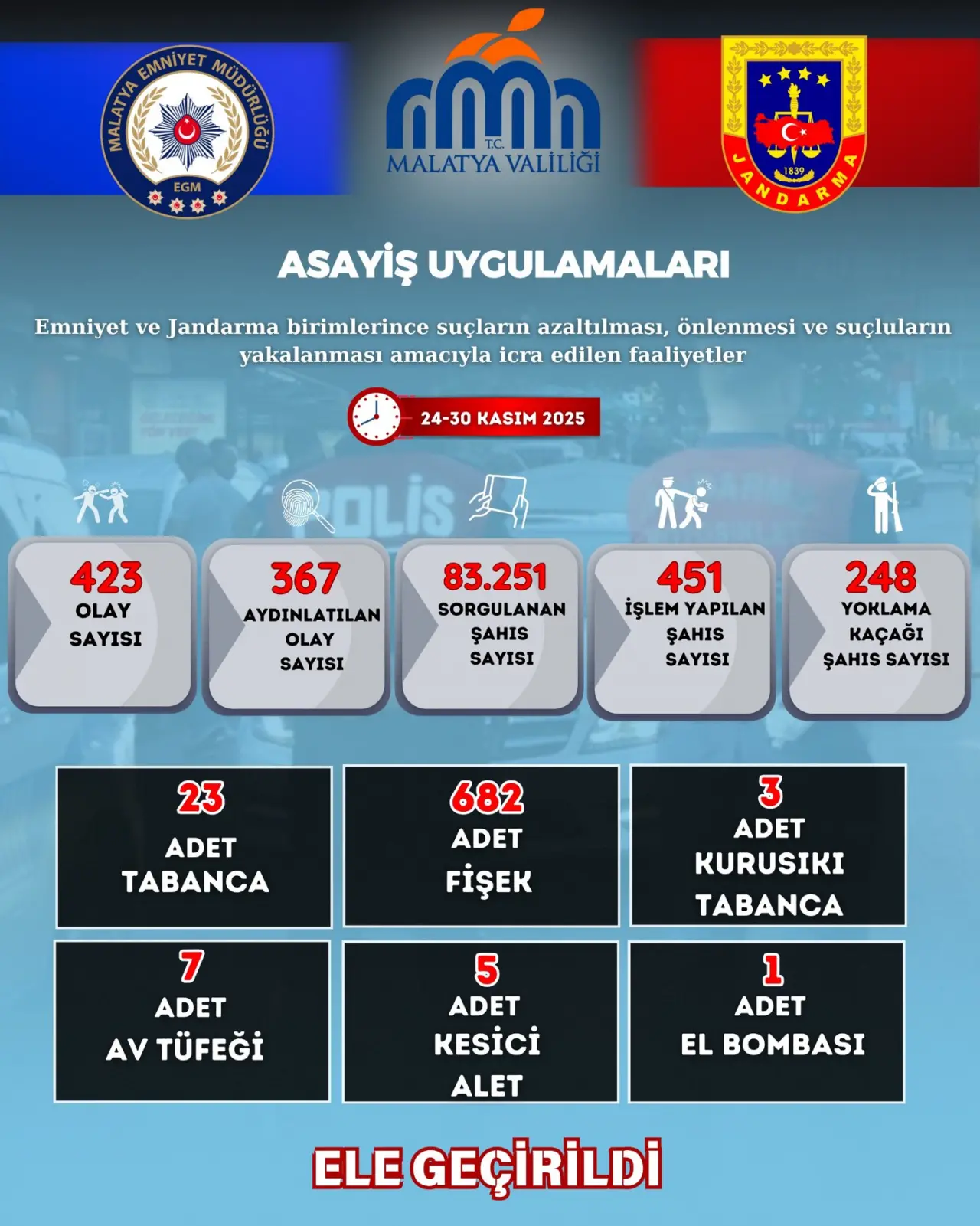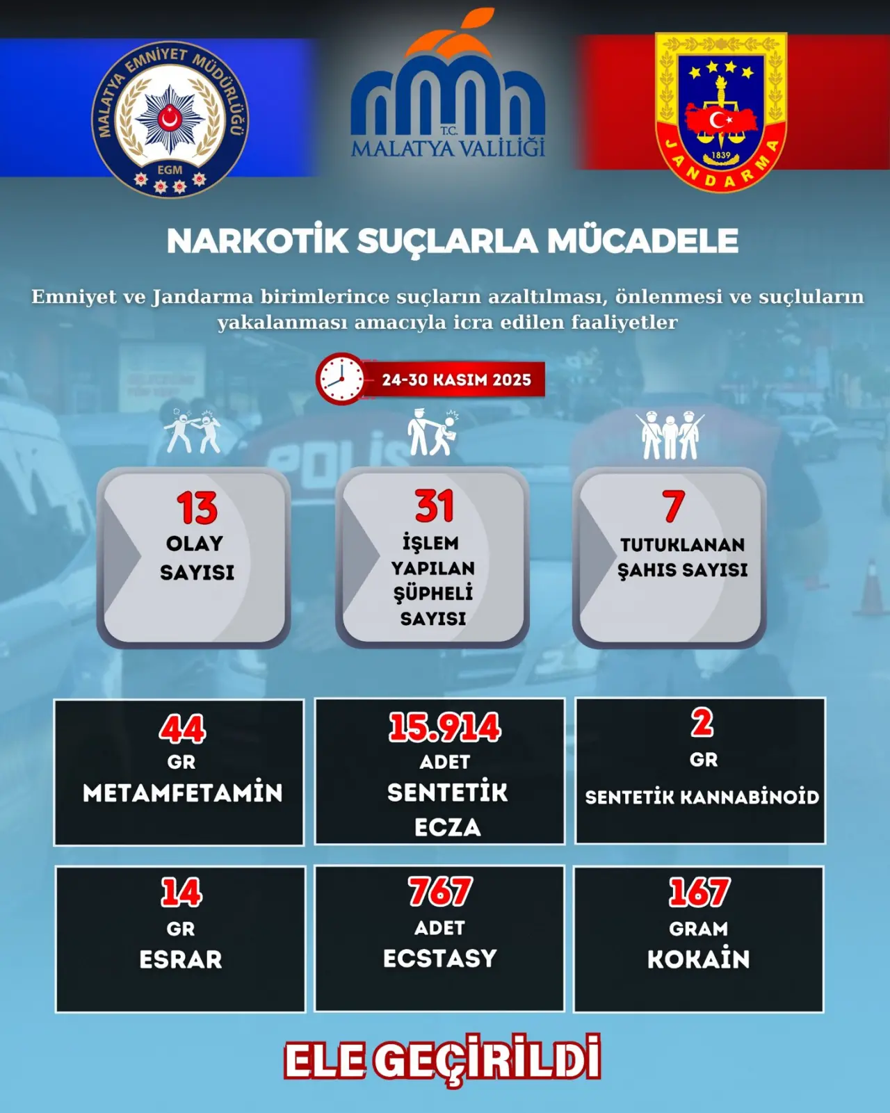 Vali Seddar Yavuz başkanlığında yapılan İl Güvenlik Toplantısı’nda, 24–30 Kasım tarihleri arasında yürütülen operasyonların sonuçları masaya yatırıldı. Narkotik, asayiş ve trafik alanlarında kapsamlı uygulamalarla Malatya’da huzur çıtası yükseldi.