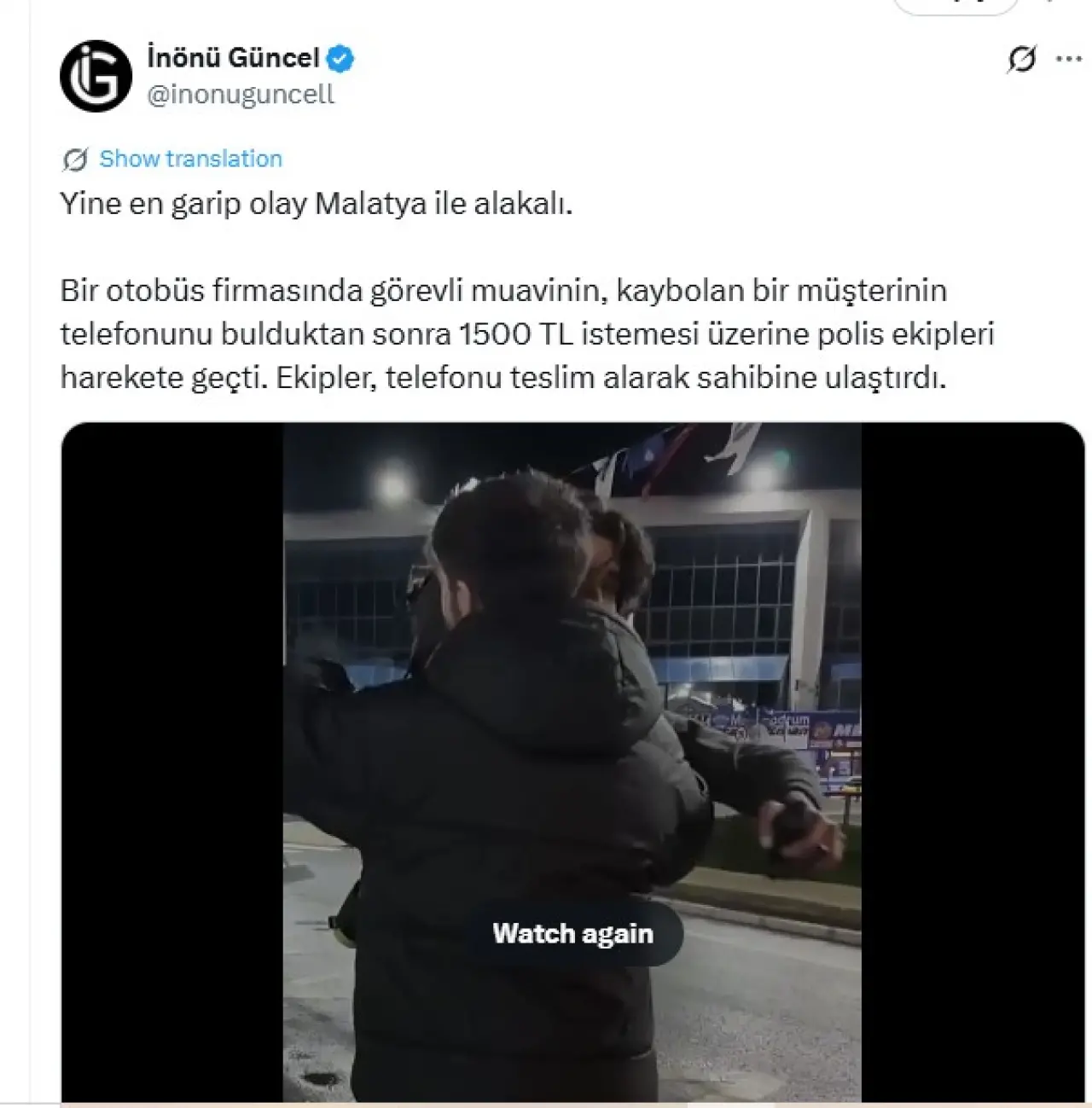 Telefonuna polis yardımı ile ulaşan genç çektiği videoyu ise sosyal medyasında paylaştı. Olay sosyal medyada da geniş yankı buldu. Çok sayıda kullanıcı, “Telefonu bulup iade edeceğine para istemiş, pes doğrusu!” yorumları yaptı. Malatya’nın en güçlü sosyal medya platformlarından İnönü Güncel’de videoyu yayınlayarak Malatya’nın yüzkarası muavini rezil etmiş oldu.