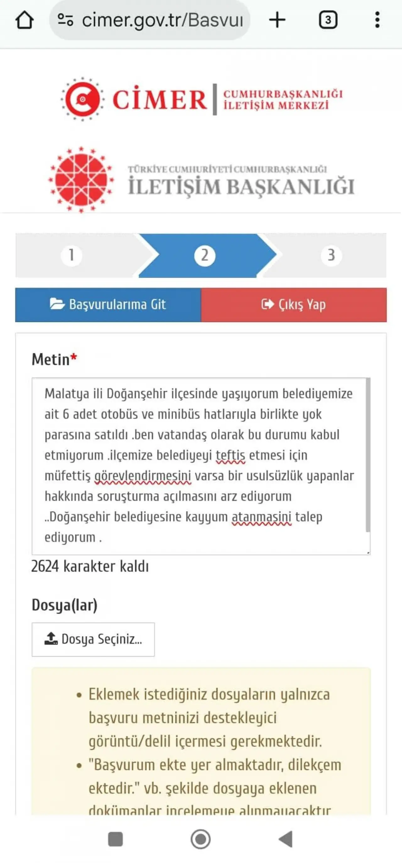 “Malatya ili Doğanşehir ilçesinde yaşıyorum. Belediyemize ait 6 adet otobüs ve minibüs, hatlarıyla birlikte yok pahasına satıldı. Bir vatandaş olarak bu durumu kabul etmiyorum. İlçemiz ve belediyemiz hakkında teftiş yapılması için müfettiş görevlendirilmesini talep ediyorum.”