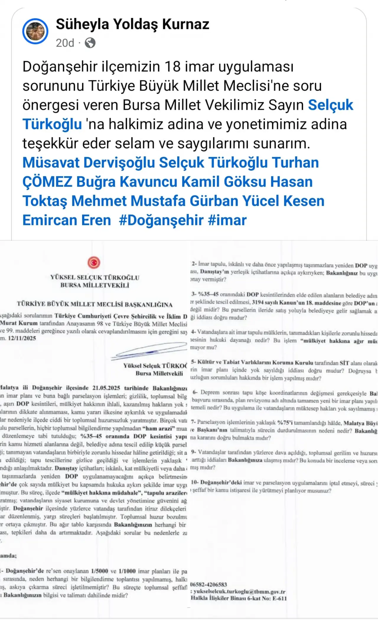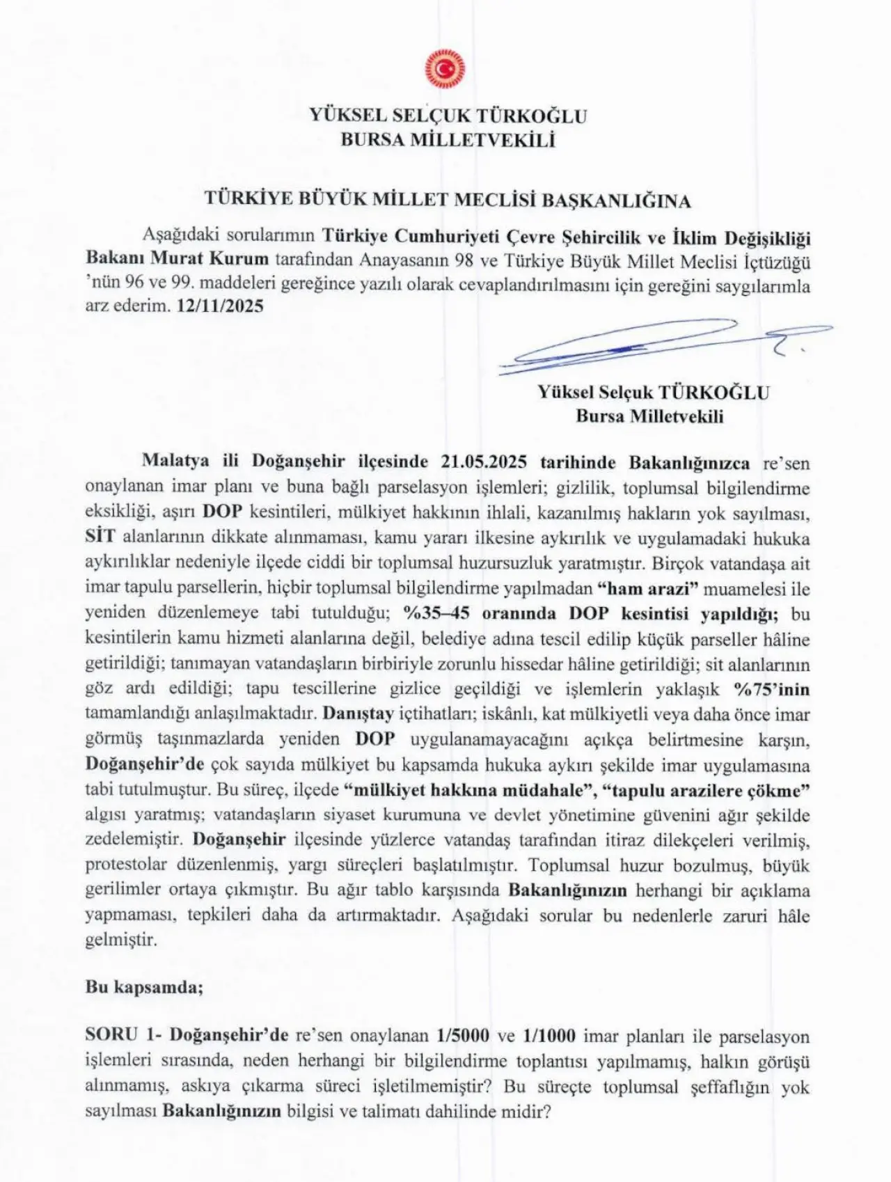 Bu gelişmelerin ardından konu bir kez daha Meclis gündemine geldi. İYİ Parti Bursa Milletvekili Yüksel Selçuk Türkoğlu, Doğanşehir’deki imar planına ilişkin 10 maddelik kapsamlı bir soru önergesi hazırlayarak Çevre, Şehircilik ve İklim Değişikliği Bakanı Murat Kurum’un yanıtlamasını istedi.