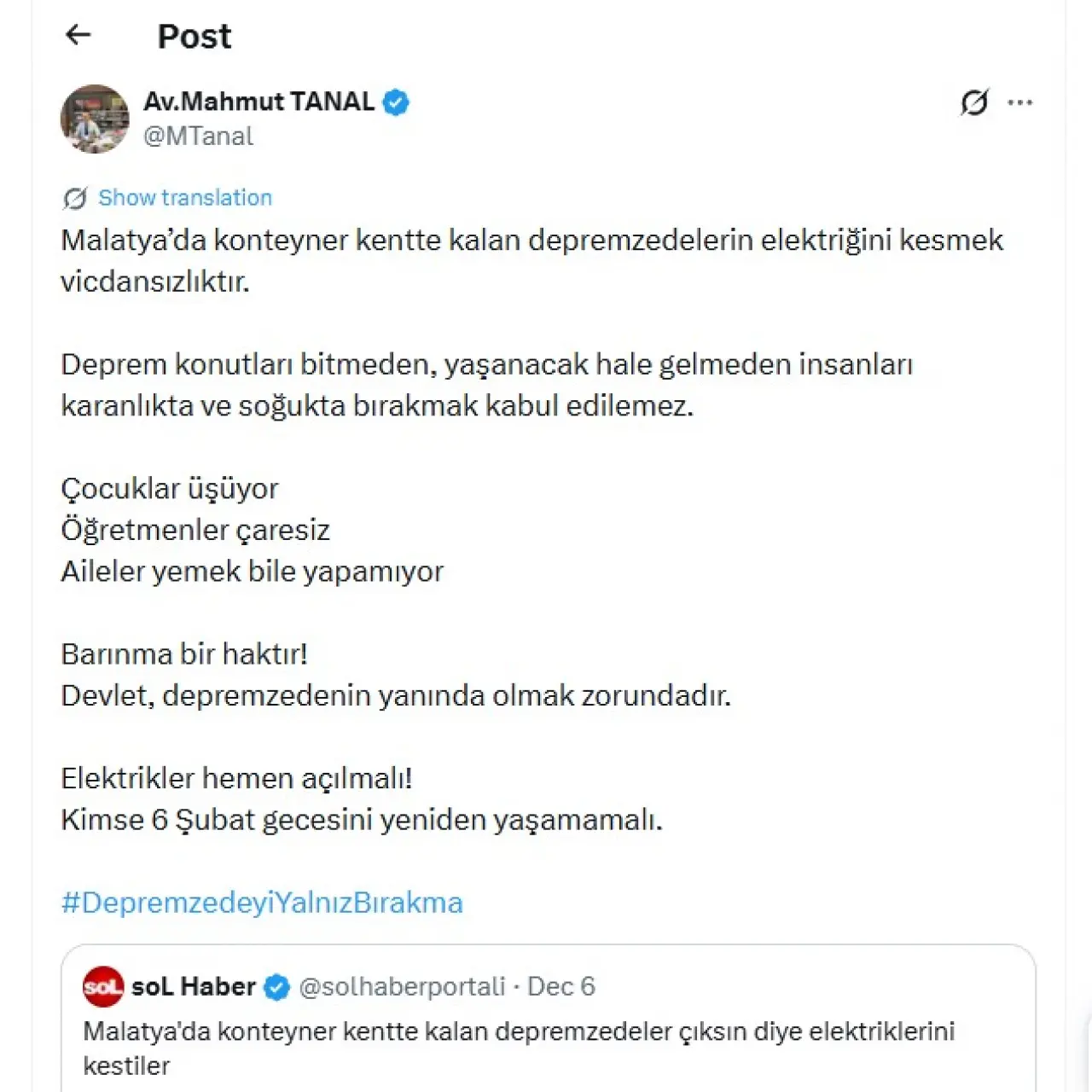 “Malatya’da konteyner kentte kalan depremzedelerin elektriğini kesmek vicdansızlıktır. Deprem konutları bitmeden insanları karanlıkta ve soğukta bırakmak kabul edilemez. Çocuklar üşüyor, aileler yemek bile yapamıyor.