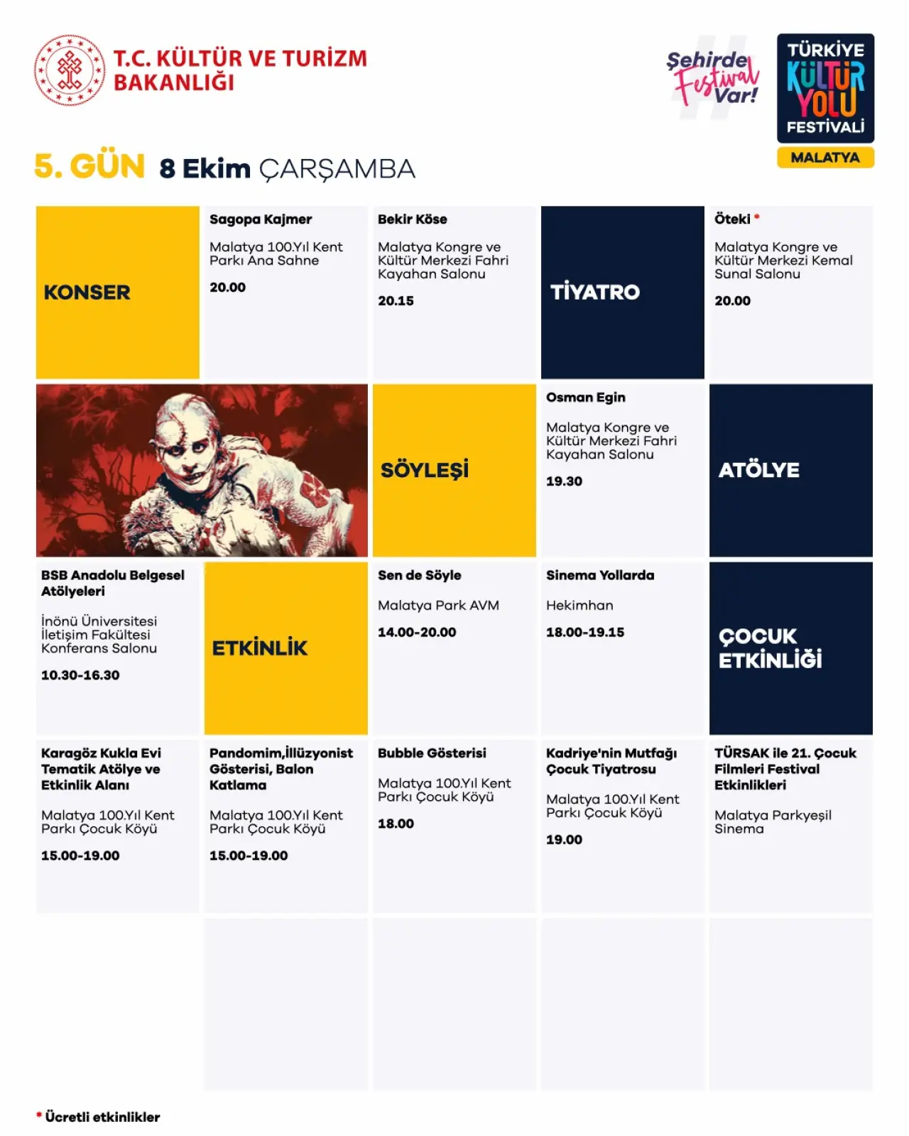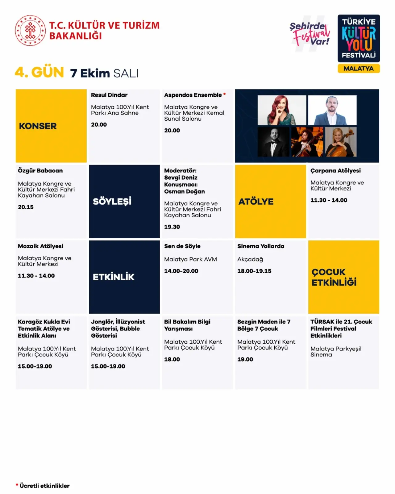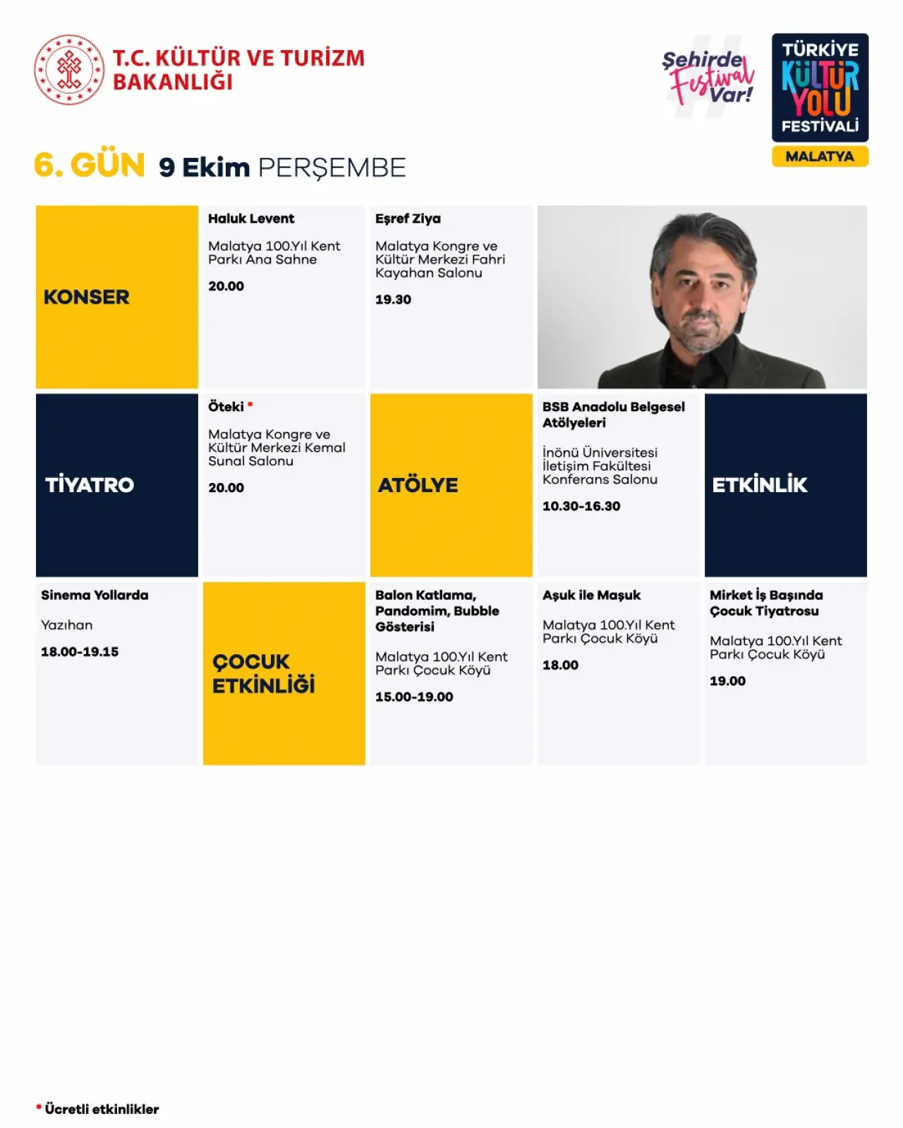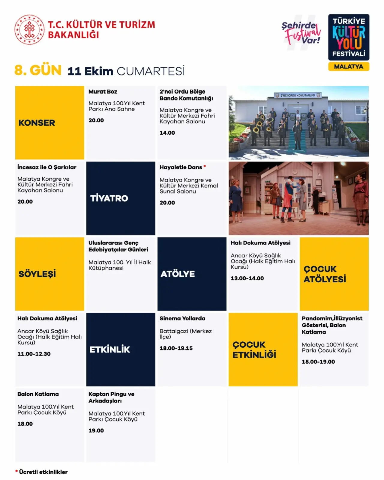 Sokak konserleri, atölyeler, söyleşiler, tiyatro, sergi ve gastronomi buluşmalarıyla Malatya 9 gün boyunca kültürle yoğrulacak. Geleneksel el sanatlarından çağdaş eserlere kadar sanatın her dalı, festival boyunca Malatya’da hayat bulacak. Türkiye Kültür Yolu Festivali 4 Ekim’de başlıyor; Malatya’yı sanata doyuracak büyük şölene herkes davetli!