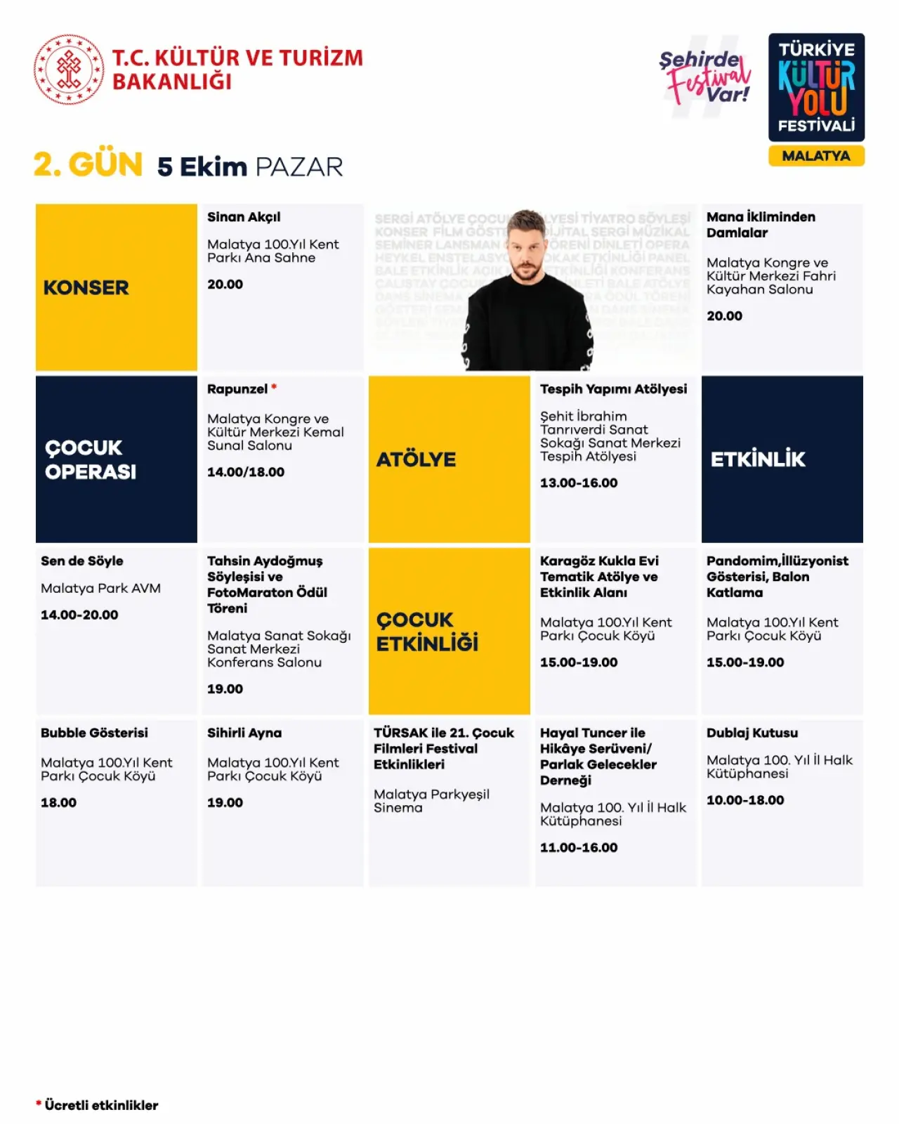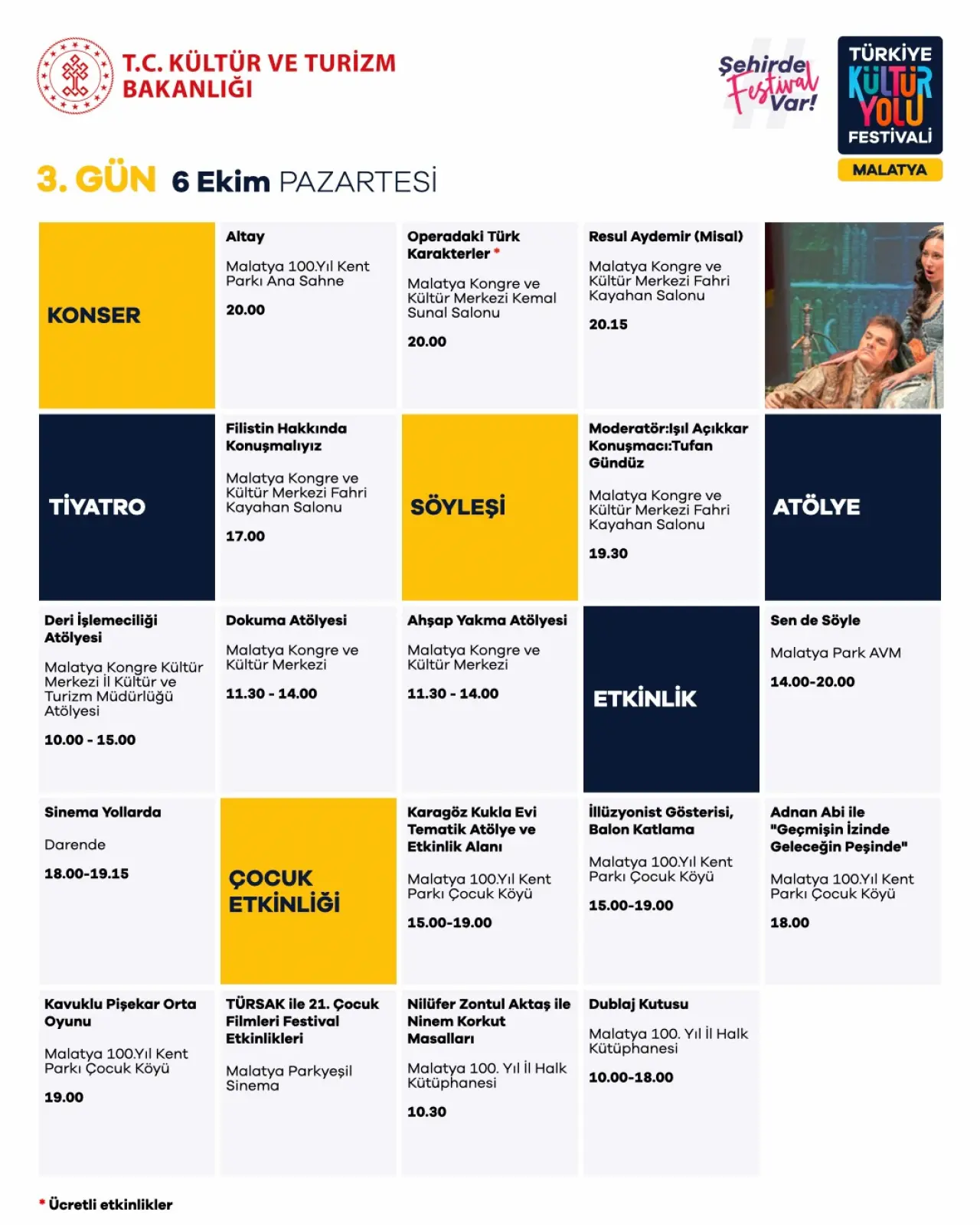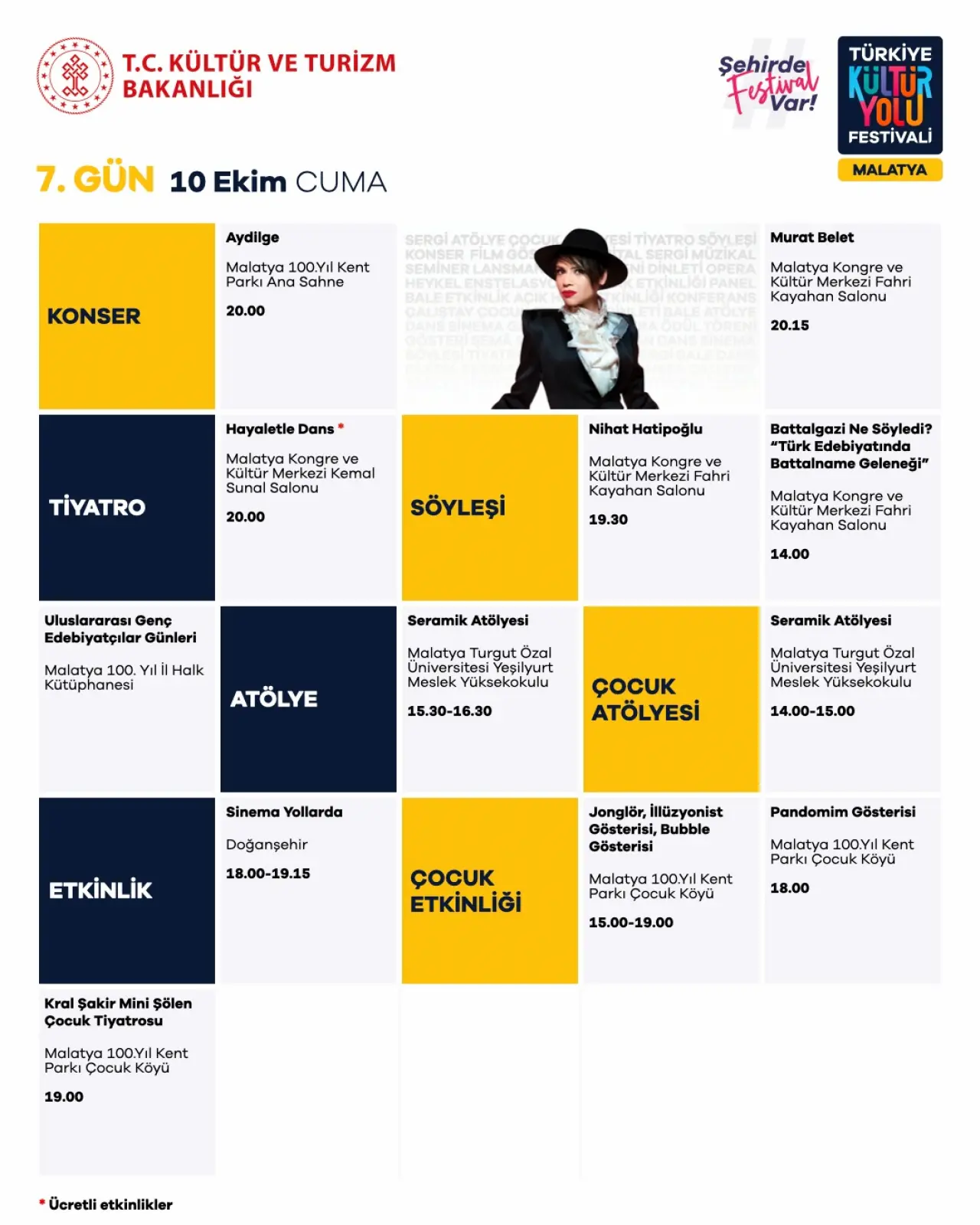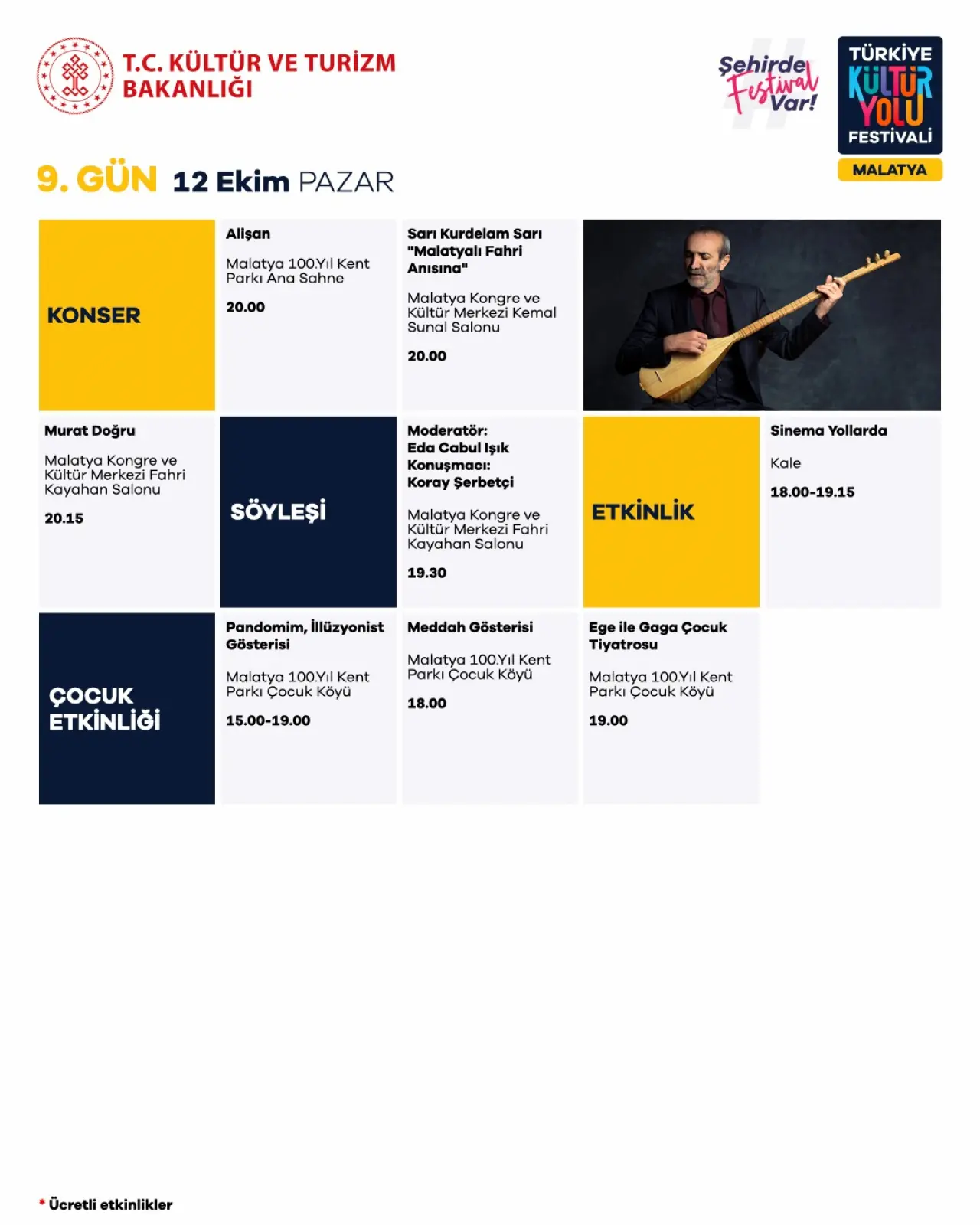Sokak konserleri, atölyeler, söyleşiler, tiyatro, sergi ve gastronomi buluşmalarıyla Malatya 9 gün boyunca kültürle yoğrulacak. Geleneksel el sanatlarından çağdaş eserlere kadar sanatın her dalı, festival boyunca Malatya’da hayat bulacak. Türkiye Kültür Yolu Festivali 4 Ekim’de başlıyor; Malatya’yı sanata doyuracak büyük şölene herkes davetli!