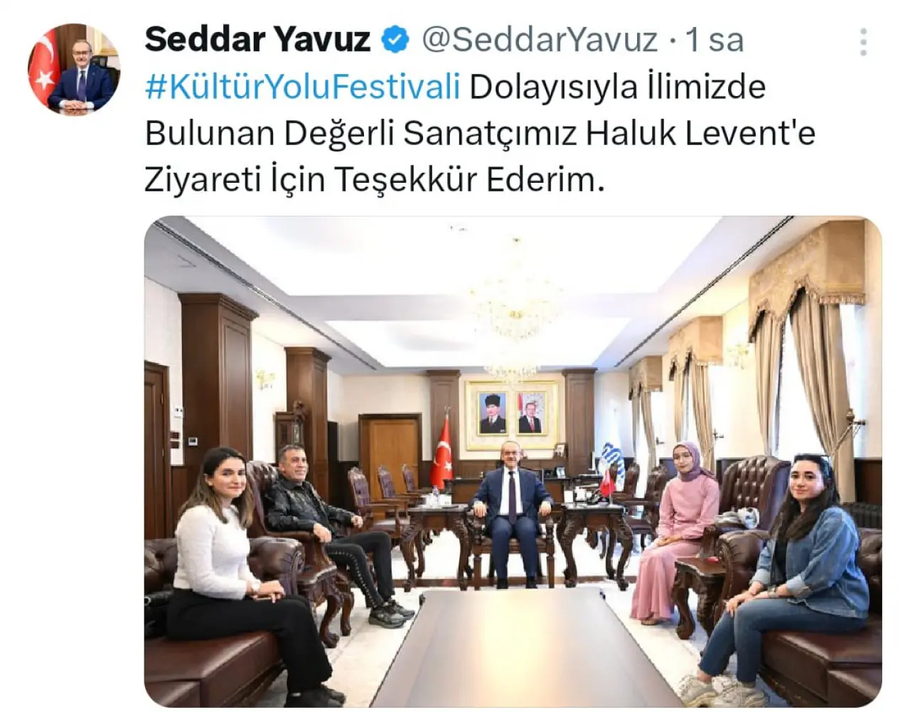 “Kültür Yolu Festivali dolayısıyla ilimizde bulunan değerli sanatçımız Haluk Levent’e ziyareti için teşekkür ediyorum” ifadelerini kullandı.