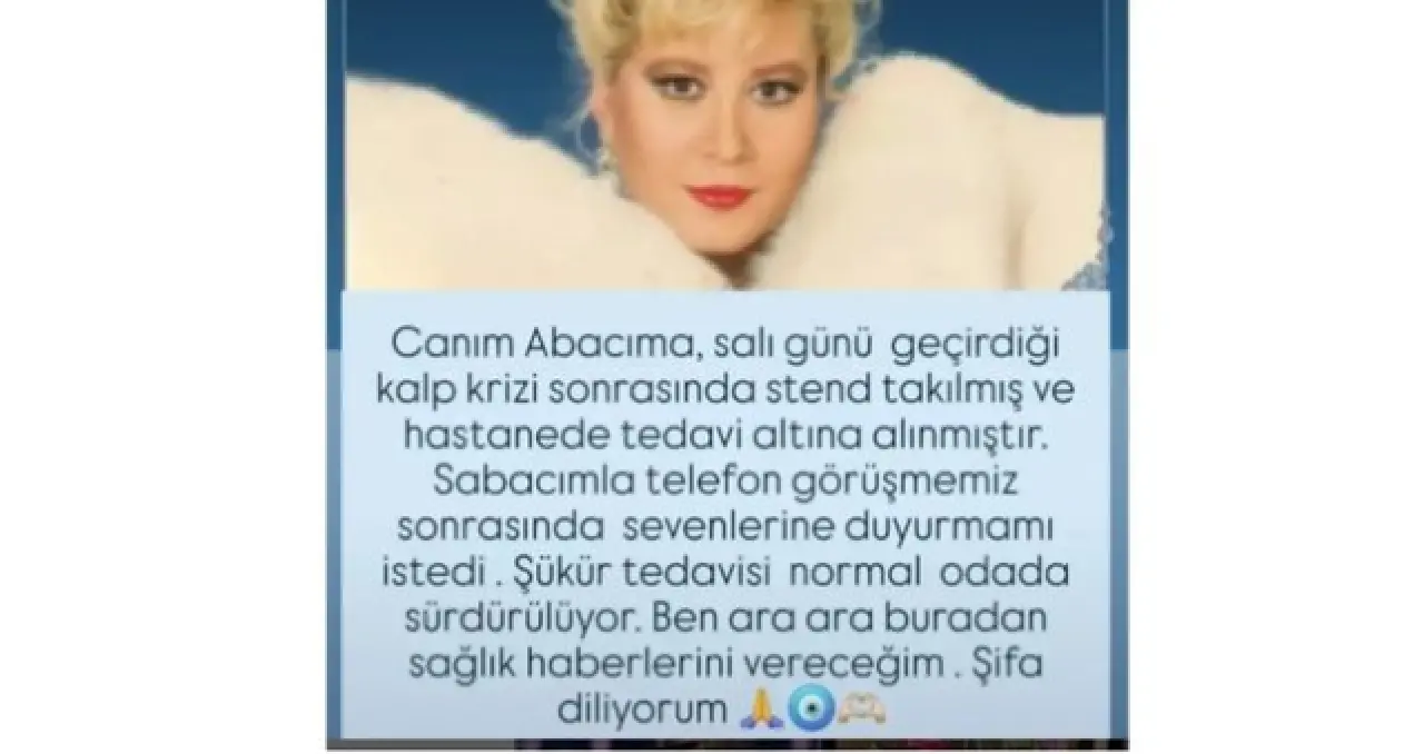 “Canım Abacıma, salı günü geçirdiği kalp krizi sonrasında stent takılmış ve hastanede tedavi altına alınmıştır. Abacı ile telefon görüşmemiz sonrasında sevenlerine duyurmamı istedi. Şükür tedavisi normal odada sürdürülüyor. Ben ara ara buradan sağlık haberlerini vereceğim. Şifa diliyorum.”