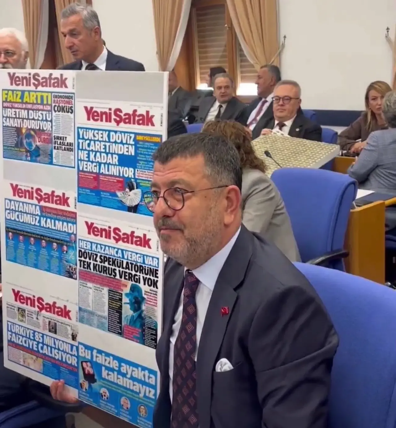 “Şuna bakın arkadaşlar, bu iktidarın yayın organı. Bu manşetleri gören Mehmet Şimşek’i CHP’nin Bakanı sanar. Ama Mehmet Şimşek Ak Partinin Bakanı ve kendi medyası bile Mehmet Şimşek’in iktidarın uyguladığı politikaya inanmıyor. Türkiye’nin hali bu birbirine girmiş durumdalar. Biri A diğer biri B diyor, Yeni Şafak’a Mehmet Şimşek için atılan manşetler gösteriyor.