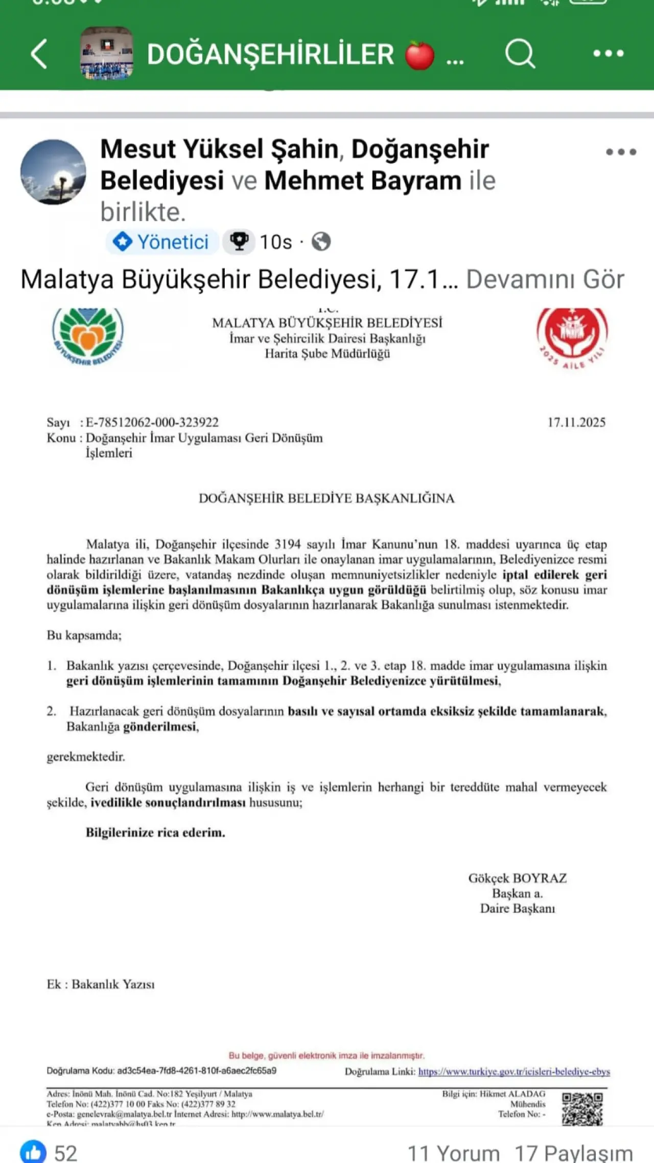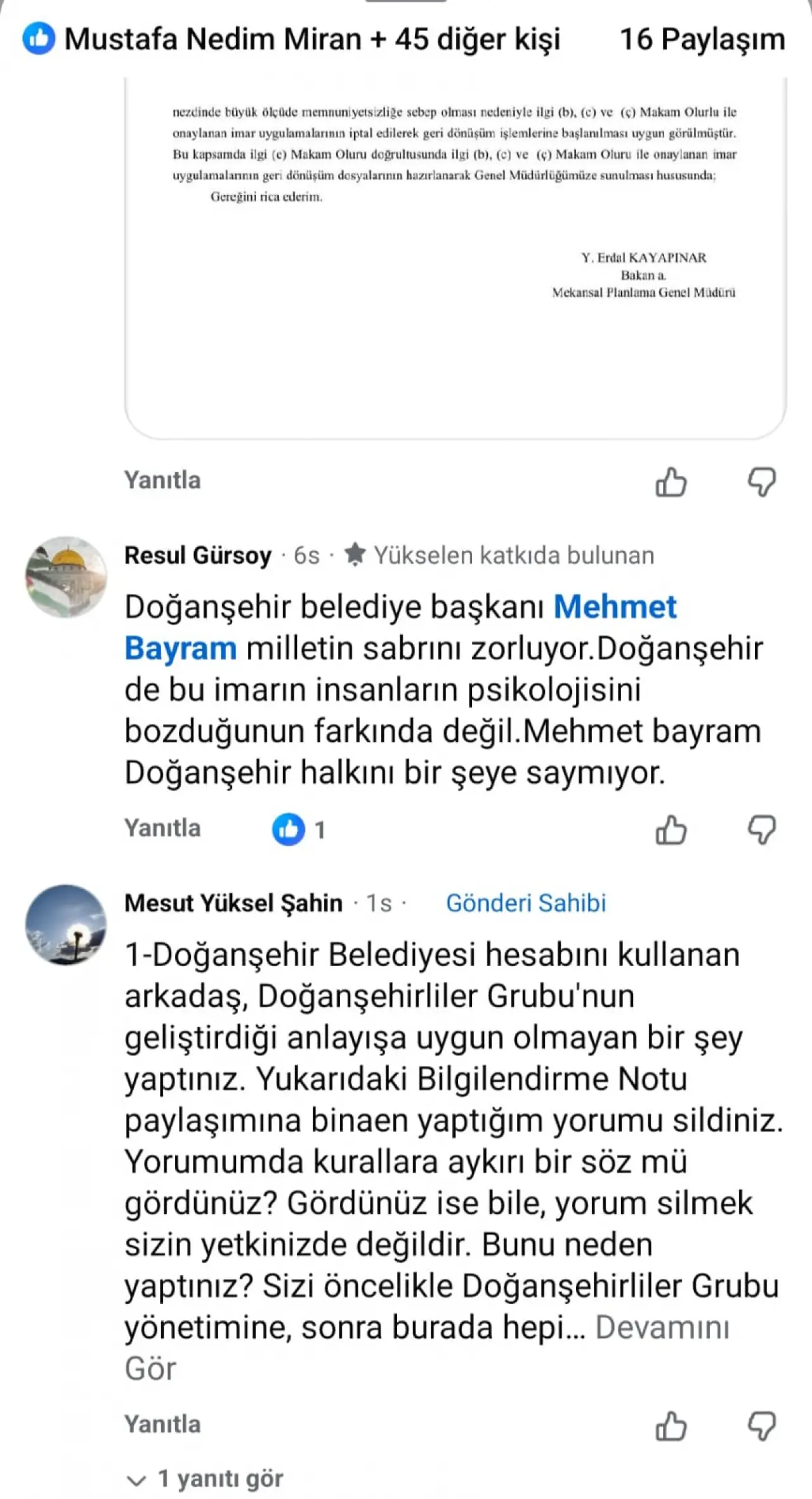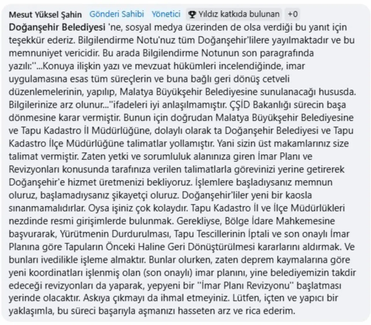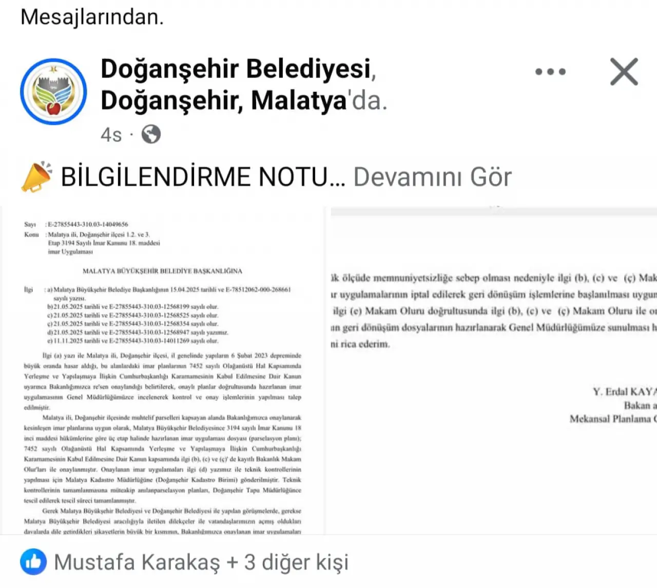 Grubun yöneticilerinden olan Doğanşehirli Mesut Yüksel Şahin isimli vatandaş Bakanlığın iptal yazısını paylaşarak Doğanşehir Belediyesi’ne sordu: