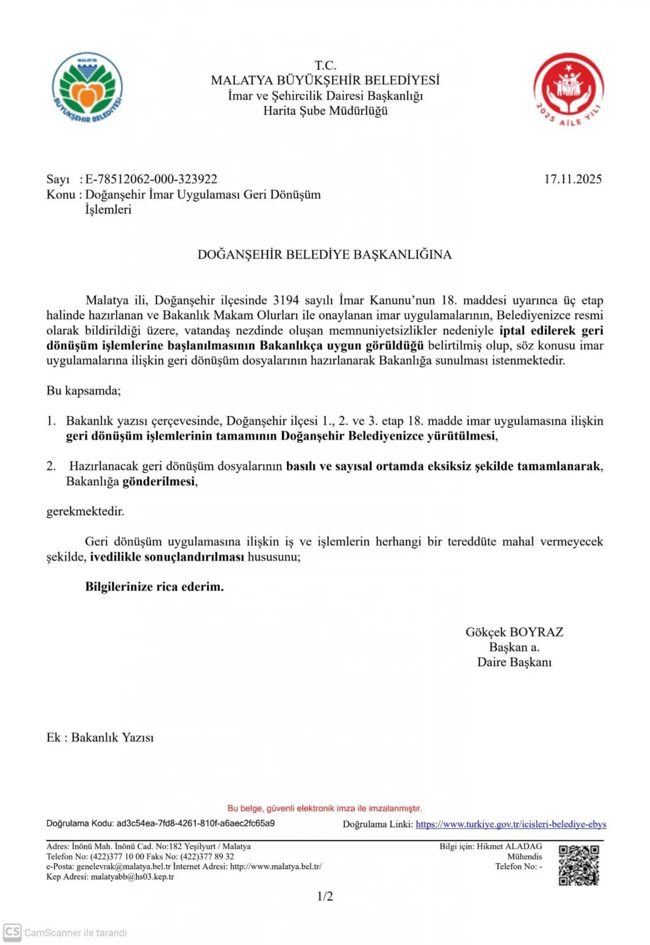 Gönderilen yazıda, daha önce onaylanan üç hesaplı imar uygulamasının vatandaş memnuniyetsizliği, şikâyetler ve yoğun kamuoyu baskısı sebebiyle iptal edilerek geri dönüşüm sürecine alınmasının uygun bulunduğu açıkça belirtildi. Bu karar, son aylarda Doğanşehir halkının beklentilerinin merkezinde yer alan en önemli talep olarak görülüyordu.