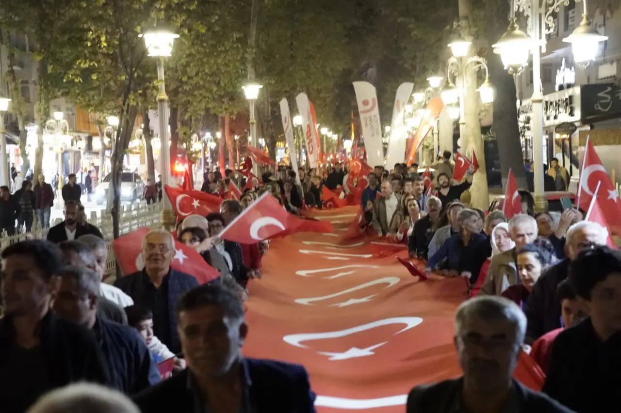 Yürüyüşün sonunda kalabalık, Onuncu Yıl Marşı ve İzmir Marşı’nı hep bir ağızdan söyleyerek dev Türk bayrağını açtı.