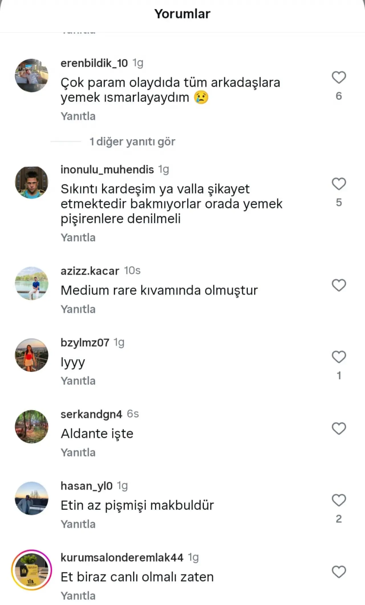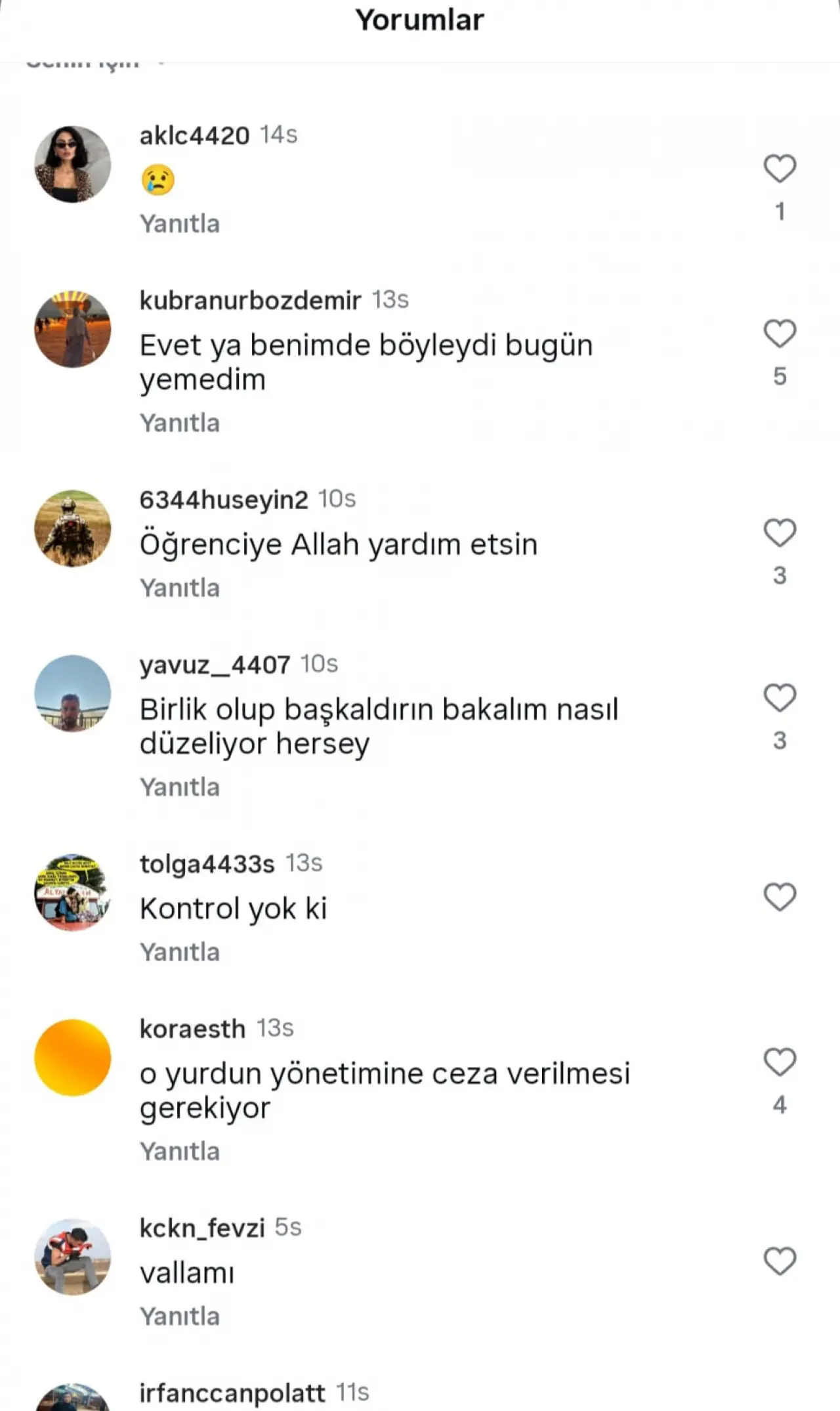 Kübranur B. - "Yemekler gerçekten dayanılmaz bir hâl aldı. Sabah kahvaltısında çürük zeytinler, öğle ve akşam yemeklerinde ise az pişmiş, kanlı et parçaları geliyor. Bazen yemek yemeyi bırakmak zorunda kalıyoruz. Bu durumu yetkililere ilettik ama hiçbir geri dönüş yok. Artık ailelerimize bile bildirmek zorunda kaldık, çünkü başka çaremiz yok. Bu şehirde öğrenciyi hiçe sayıyorlar."