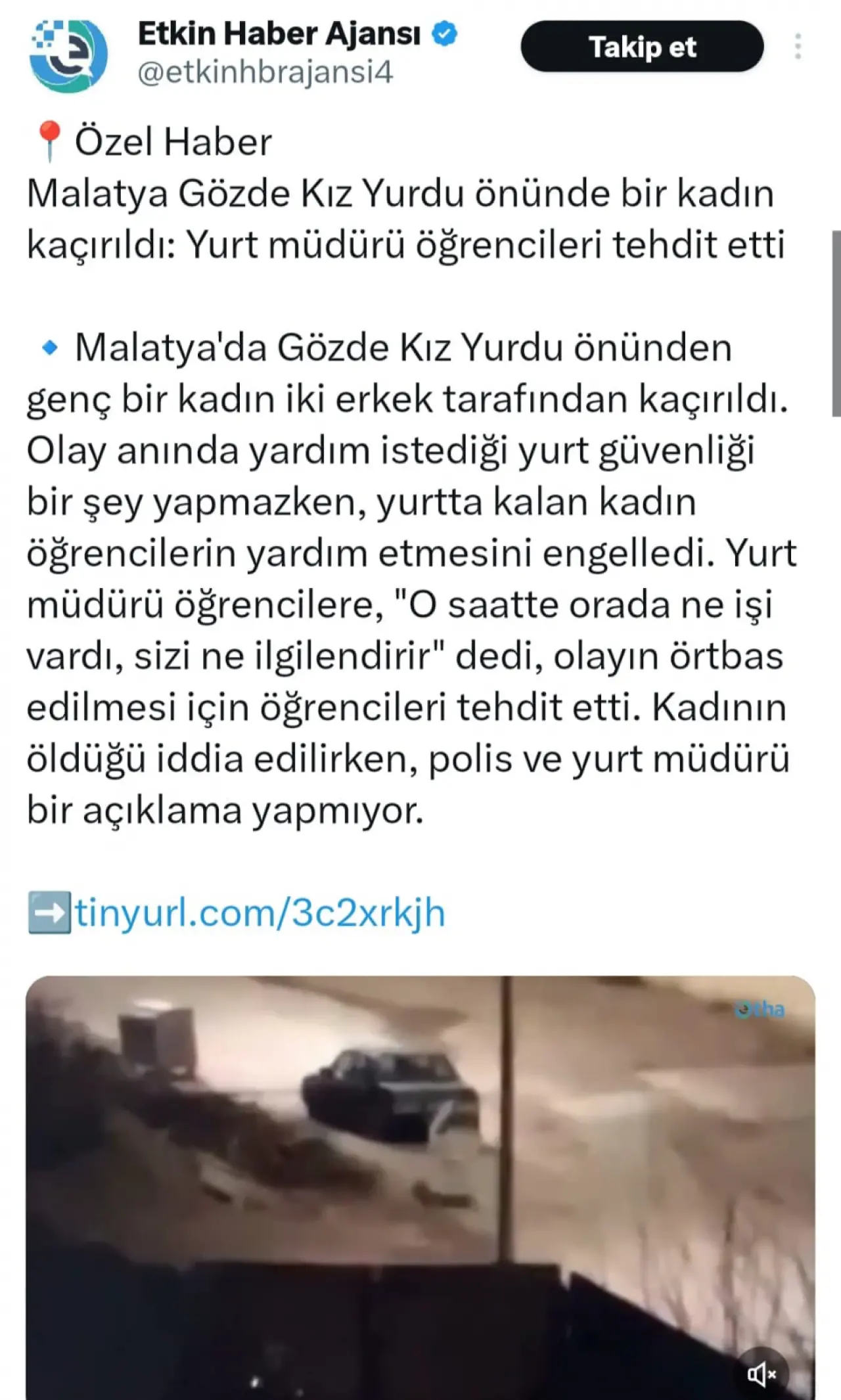 “Malatya'da Gözde KYK yurdu önünden genç bir kadın iki erkek tarafından kaçırıldı. Olay anında yardım istediği yurt güvenliği bir şey yapmazken, yurtta kalan kadın öğrencilerin yardım etmesini engelledi. Kaçırılan kadın 200 metre sonra araçtan düştü, ancak araçtaki iki erkek kadını zorla araca bindirdi. Yurt müdürü öğrencilere, ‘O saatte ne işi vardı, sizi ne ilgilendirir’ diyerek olayı meşrulaştırmaya çalıştı, olayın örtbas edilmesi için öğrencileri tehdit etti.