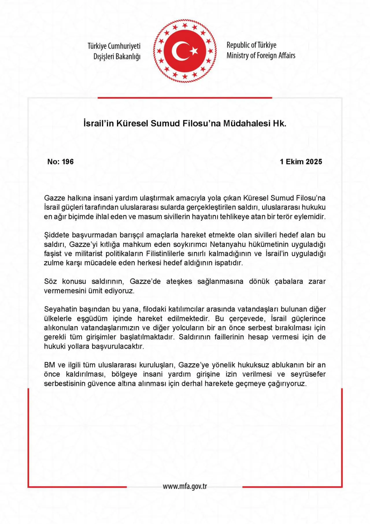 “Sumud Filosuna yapılan saldırıyı ve hukuksuz kuşatmayı en güçlü şekilde kınıyorum. İnsani yardım götürmekten başka amacı olmayan bu girişime yönelik engelleme, uluslararası hukuka ve insanlık vicdanına ağır bir darbedir. Filistin’in meşru mücadelesinin yanında olmaya devam edeceğimizi, Gazze’ye uygulanan ablukanın derhal kaldırılması gerektiğini bir kez daha vurguluyorum. Türkiye olarak, mazlumların sesi olmayı sürdüreceğiz.”