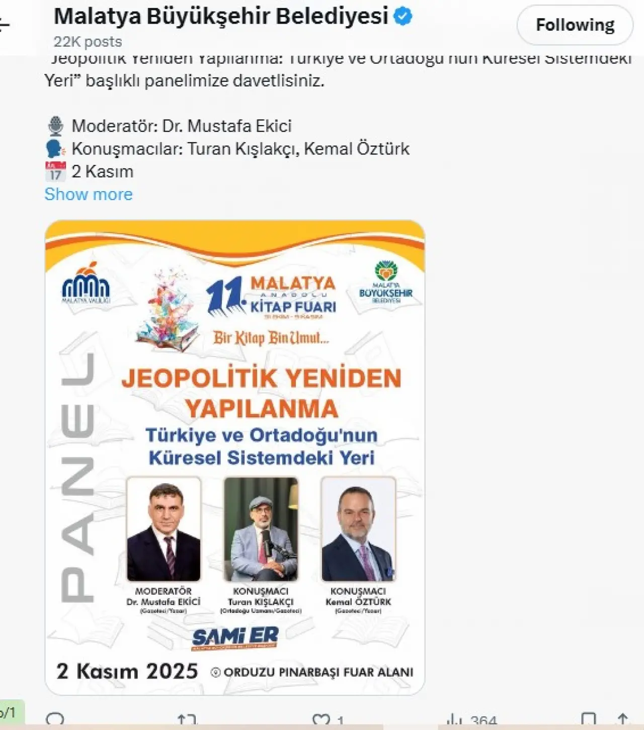 Öte yandan, Malatya Büyükşehir Belediyesi’nin sosyal medya hesaplarında yapılan paylaşımlar bir kez daha tartışma konusu oldu. Belediye, 11. Malatya Anadolu Kitap ve Kültür Fuarı etkinlikleri kapsamında düzenlenecek olan “Jeopolitik Yeniden Yapılanma: Türkiye ve Ortadoğu’nun Küresel Sistemdeki Yeri” başlıklı paneli duyurdu ancak etkinliğin saat bilgisi paylaşılmadı.