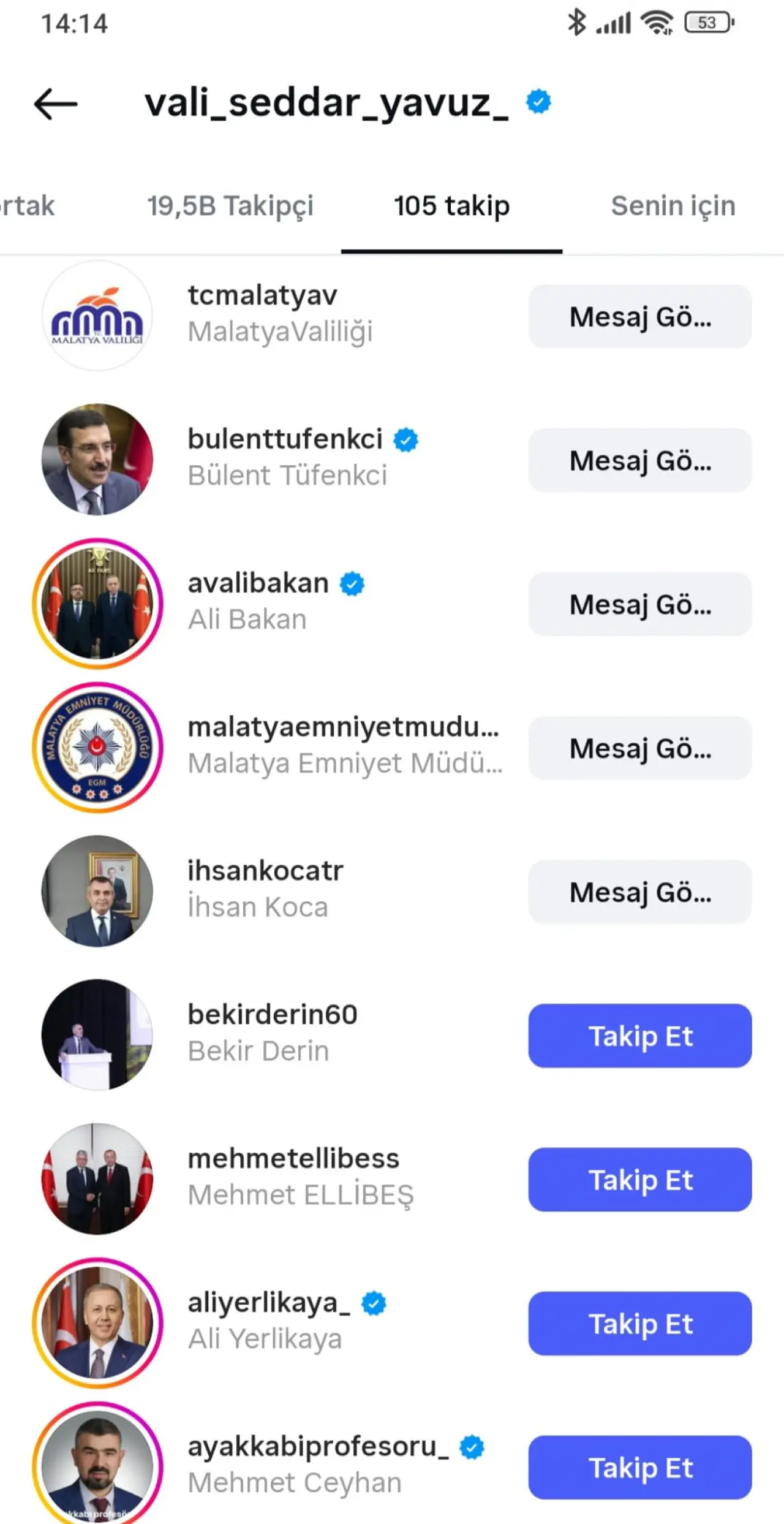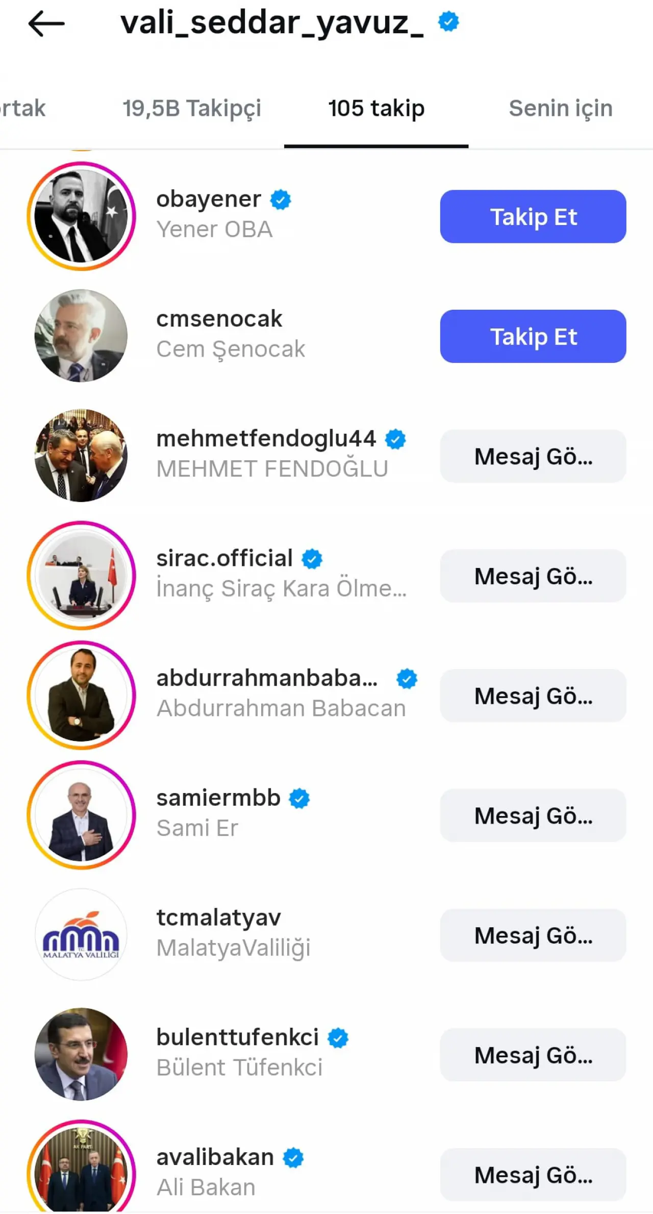 Vali Seddar Yavuz, 4 yıl aradan sonra açtığı Instagram hesabında toplam 105 kişiyi takip ediyor. Listeye baktığınızda Malatya’nın AK Parti Milletvekilleri Abdurrahman Babacan, İhsan Koca, Bülent Tüfenkçi, İnanç Siraç, Kara Ölmeztoprak ve MHP Milletvekili Mehmet Fendoğlu yer alıyor. Siyasi parti Başkanı olarak ise bir tek AK Parti İl Başkanı Ali Bakan da takip ediliyor. Takip edilenler arasında ise Malatya’nın muhalefet temsilcisi ve on binlerce oy almış CHP Milletvekili Veli Ağbaba, listede yok.