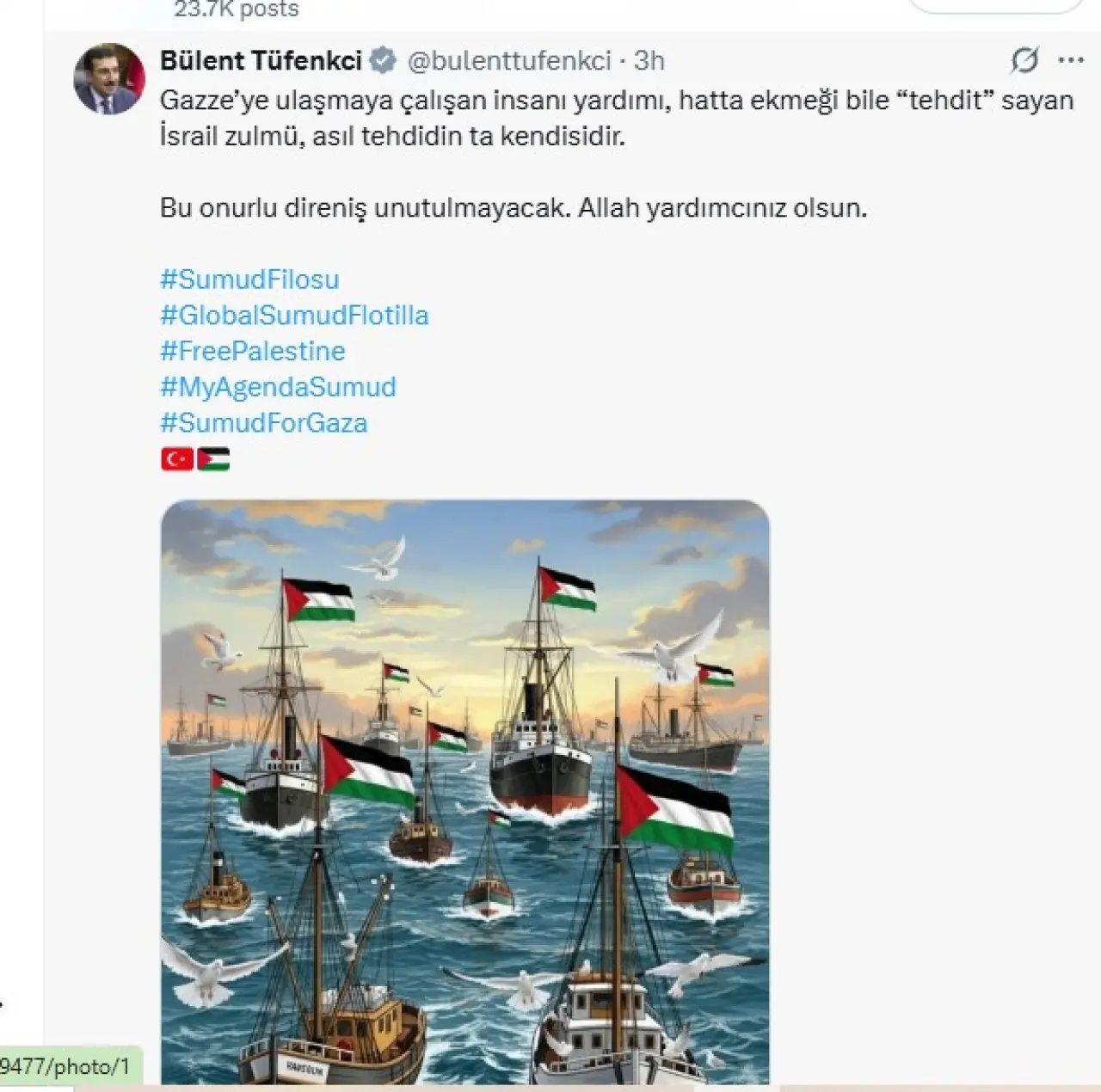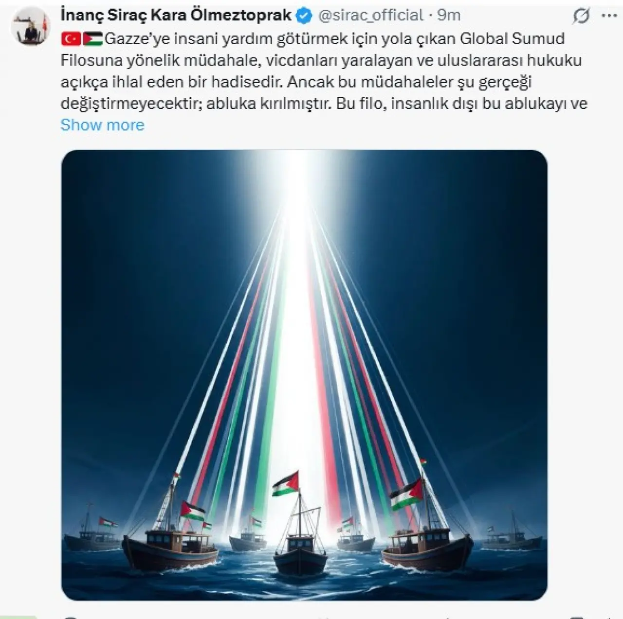 “Gazze’ye insani yardım götürmek için yola çıkan Global Sumud Filosuna yönelik müdahale, vicdanları yaralayan ve uluslararası hukuku açıkça ihlal eden bir hadisedir. Ancak bu müdahaleler şu gerçeği değiştirmeyecektir; abluka kırılmıştır. Bu filo, insanlık dışı bu ablukayı ve İsrail zulmünü Gazze’nin sesini tüm dünyaya haykırmıştır. Türkiye olarak her zaman olduğu gibi bugün de hakikatin ve insan onurunun yanında duruyoruz. Aziz milletimizin vicdanı, mazlumun gözyaşını görmezden gelmez. Bugün Gazze için yükselttiğimiz ses, insanlık onuru için yükselmiş bir sestir.”