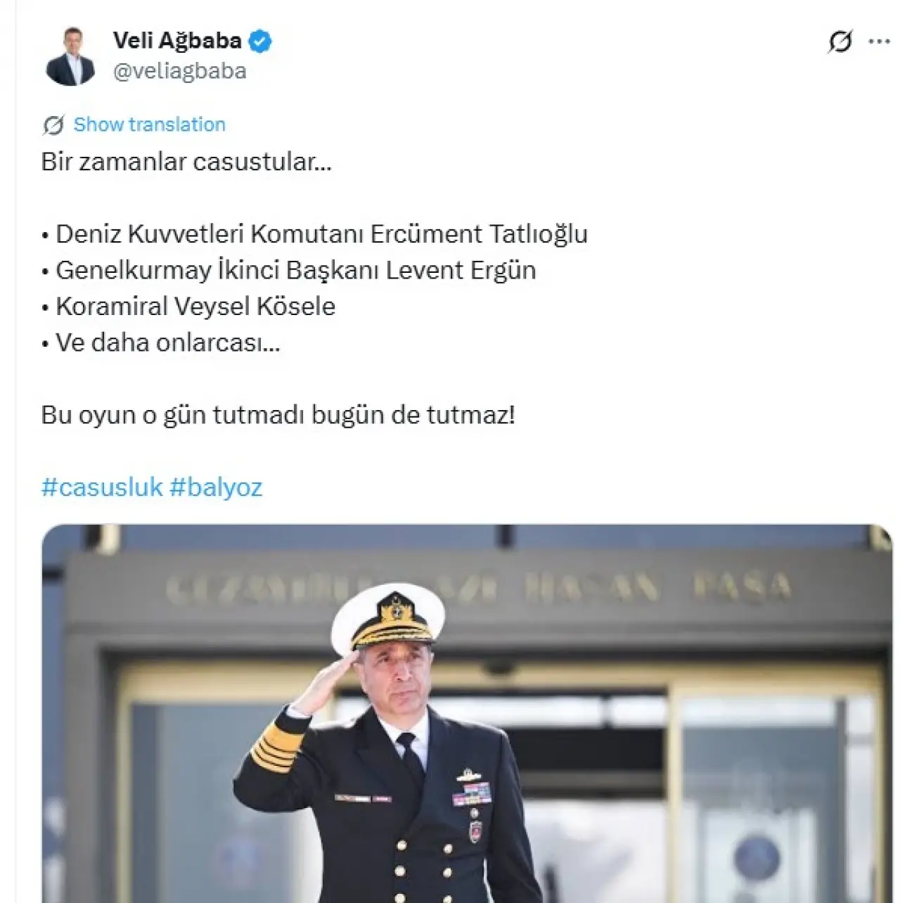Malatya Milletvekili Veli Ağbaba, paylaşımında şunları söyledi: “Bir zamanlar casuslukla suçlanan komutanlar… Bugünün Deniz Kuvvetleri Komutanı Ercüment Tatlıoğlu, Genelkurmay İkinci Başkanı Levent Ergün, Koramiral Veysel Köseoğlu ve daha onlarcası… Bir zamanlar onlar da casuslukla suçlandı, Balyoz davasında yargılandılar. Ama bugün devletin en önemli görevlerinde yer alıyorlar. O gün bu oyun tutmadı, bugün de tutmayacak.”