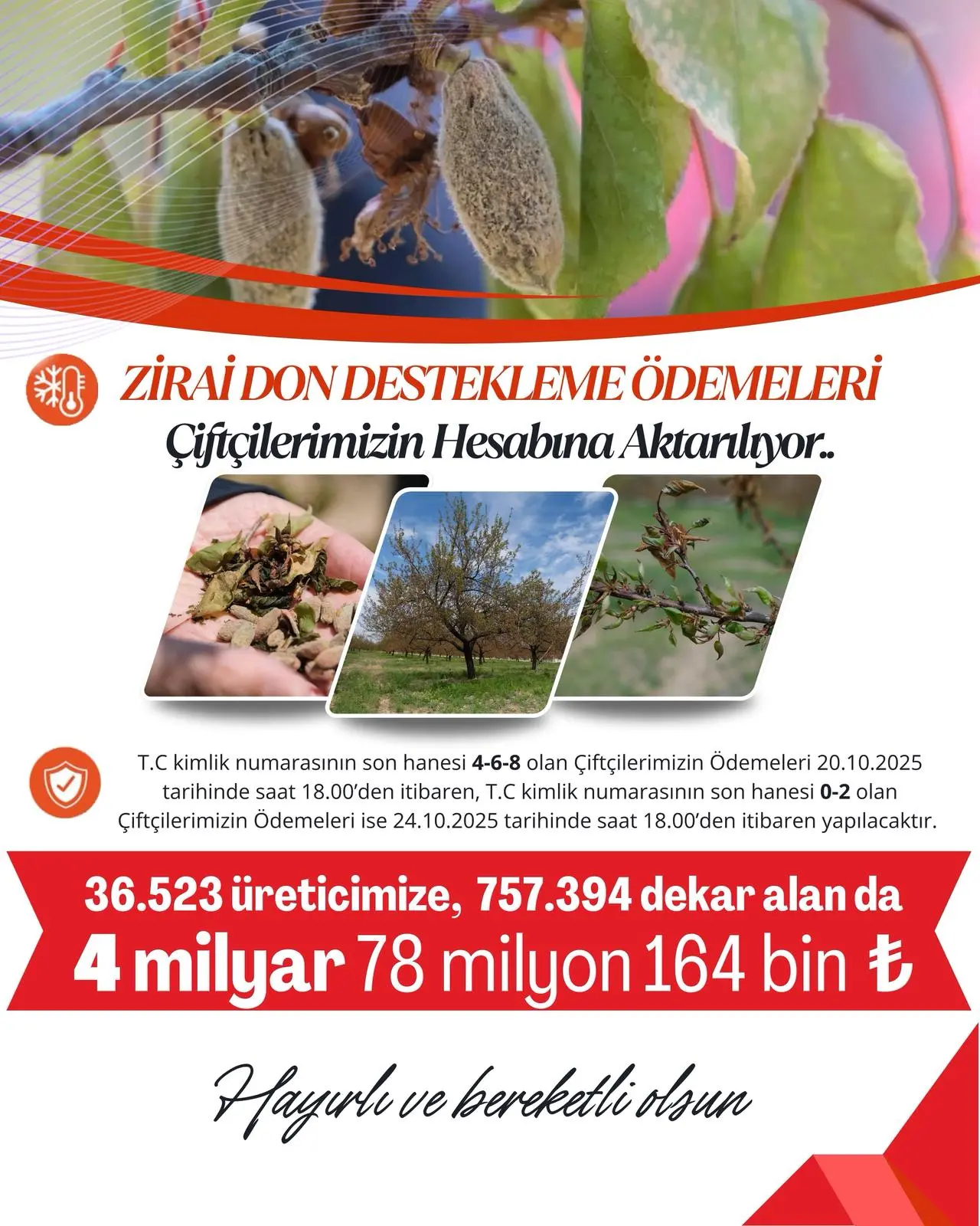 T.C. kimlik numarasının son hanesi 4, 6 veya 8 olan çiftçilerin ödemeleri 20 Ekim 2025 saat 18.00’den itibaren,