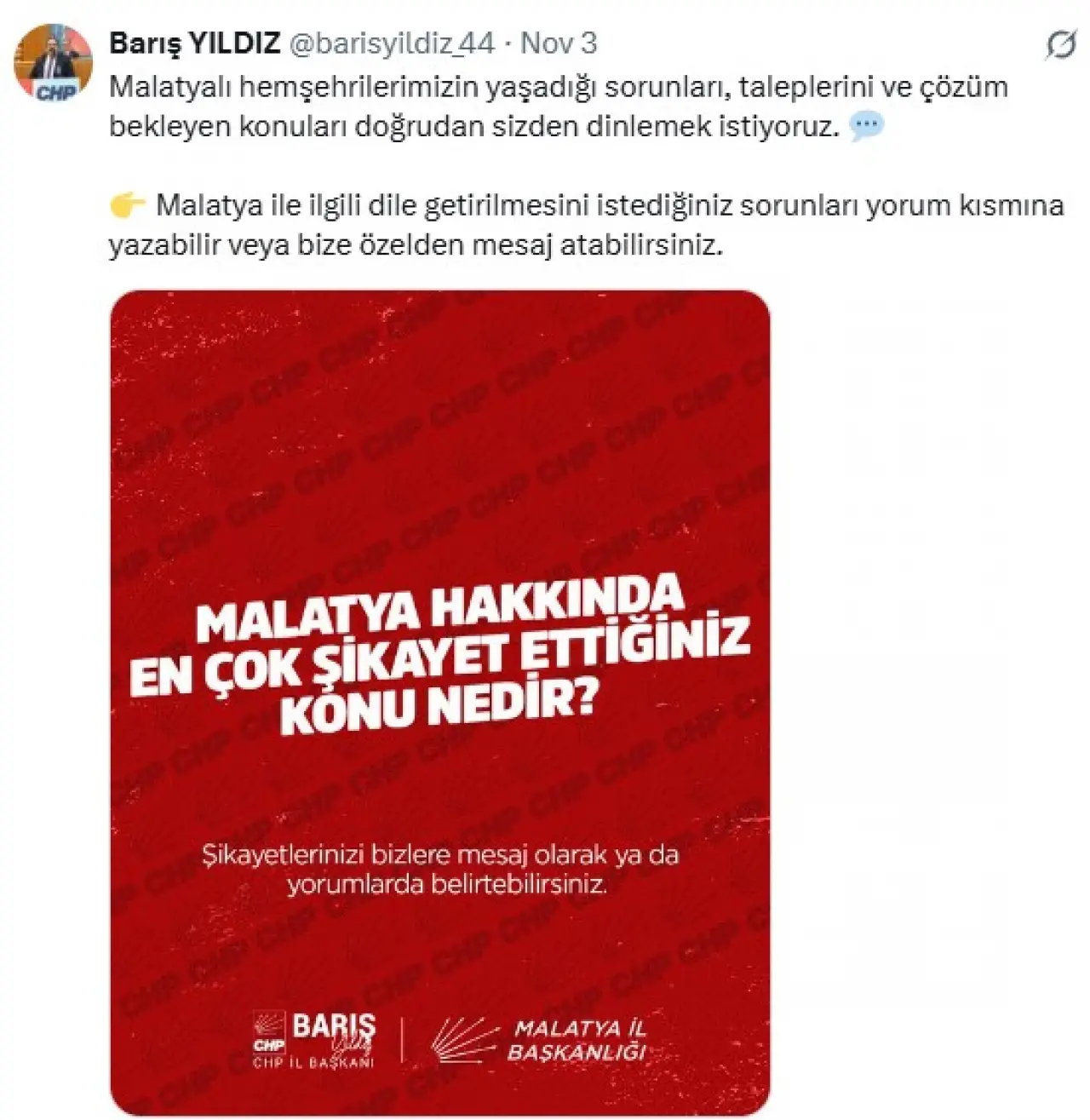 Özel olarak hazırlanan bir afişle birlikte İl Başkanlığı’nın X hesabı, Facebook ve Instagram hesaplarından paylaşım yapan Yıldız, partisinin tüm Malatyalılara kapılarının açık olduğunu vurguladı. Paylaşımda, “Malatyalı hemşerilerimizin yaşadığı sorunları, taleplerini ve çözüm bekleyen konuları doğrudan sizden dinlemek istiyoruz. Şikâyetlerinizi bizlere mesaj olarak ya da yorumlarda belirtebilirsiniz. Malatya halkının en çok şikâyet ettiği konu nedir?” ifadelerine yer verdi.
