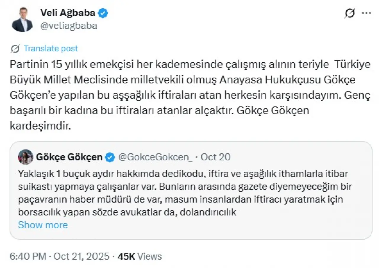 Veli Ağbaba ayrıca, Gökçen’in partideki geçmişine dikkat çekti. “Gökçe Gökçen, partimizin 15 yıllık bir emekçisi olarak her kademede çalışmış, alın teriyle bugün Meclis’te önemli bir görev üstlenmiş bir isimdir. Bu emekleri yok sayan, saldırarak itibarsızlaştırmaya çalışan herkesin karşısındayım” dedi.