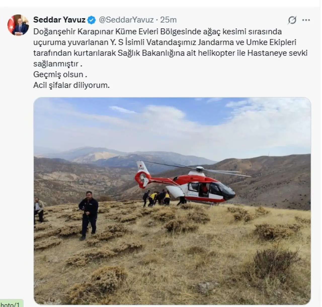 “Doğanşehir Karapınar Küme Evleri bölgesinde ağaç kesimi sırasında uçuruma yuvarlanan Y.S. isimli vatandaşımız, Jandarma ve UMKE ekiplerince kurtarılarak Sağlık Bakanlığı’na ait helikopter ambulans ile hastaneye sevki sağlanmıştır. Geçmiş olsun. Acil şifalar diliyorum.” ifadelerini kullandı.