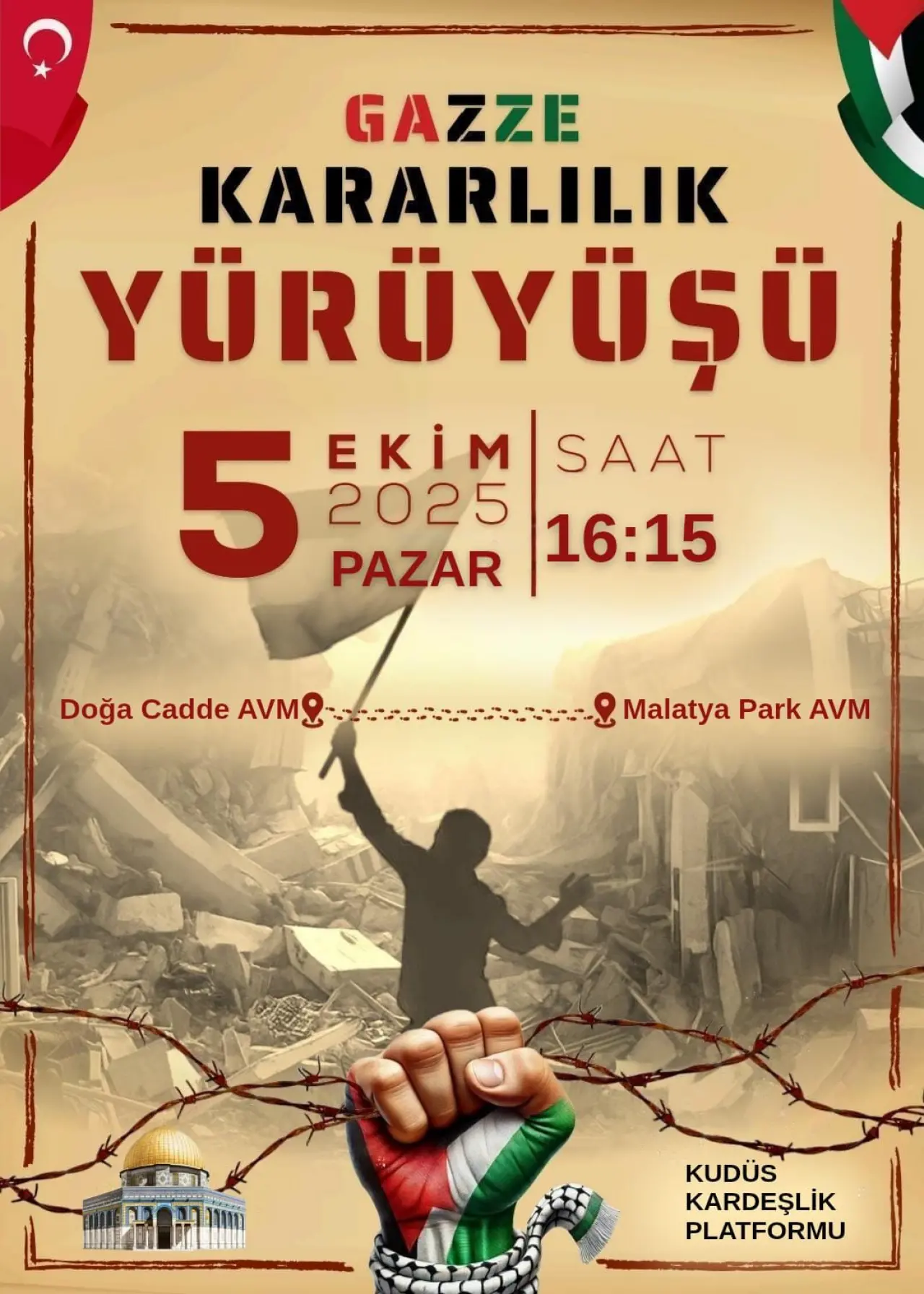 Bu kez tepkiler, daha da büyük bir organizasyona dönüşüyor. Malatya Kudüs Kardeşlik Platformu tarafından düzenlenecek olan “İsyan ve Kardeşlik Yürüyüşü” ile binlerce Malatyalı tek yürek olacak. 5 Ekim Pazar günü saat 16.15’te Doğu AVM önünden başlayacak olan yürüyüş, Malatya Park AVM önünde toplanmayla devam edecek. Organizasyona çok sayıda sivil toplum kuruluşunun yanı sıra, siyasi parti temsilcilerinin, gençlik yapılanmalarının ve kadın platformlarının da katılması bekleniyor.
