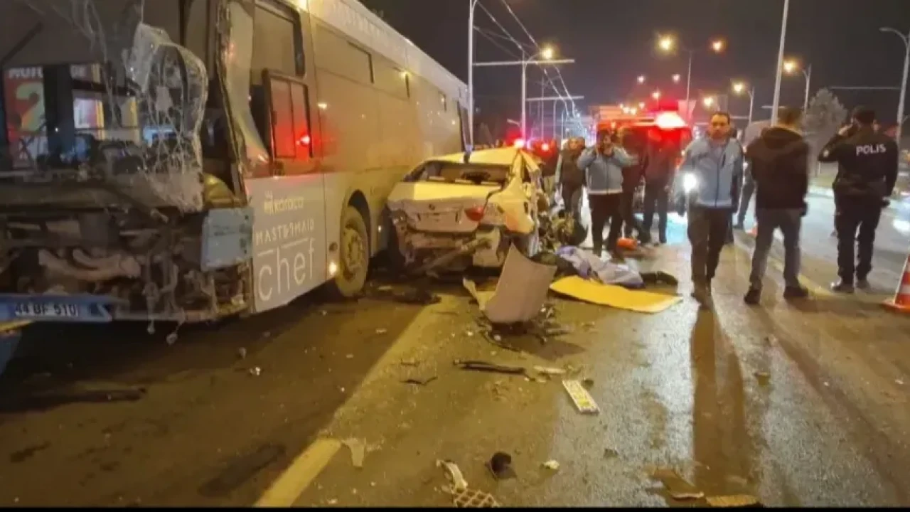 Malatya’da akşam saatlerinde yaşanan feci kazada iddiaya göre hızla ilerleyen bir otomobil, trafikte “makas” atarak manevra yaptı. Kontrolden çıkan araç, Elazığ yönüne doğru ilerleyen belediye otobüsü ile tırın arasında sıkıştı.