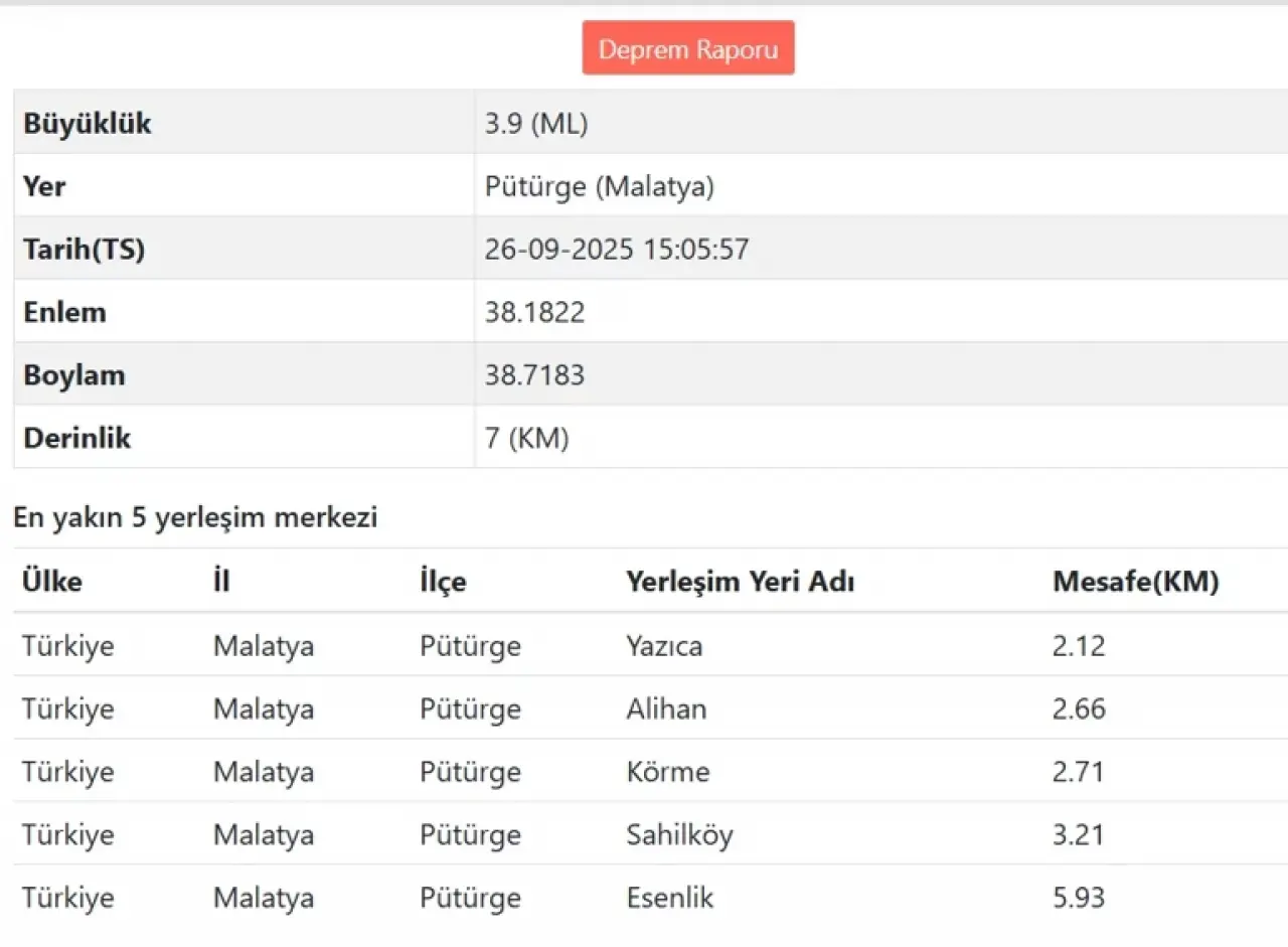 Malatya’nın Pütürge ilçesinde öğleden sonra meydana gelen deprem, şehir genelinde kısa süreli paniğe yol açtı. Afet ve Acil Durum Yönetimi Başkanlığı (AFAD) depremin büyüklüğünü 3.9, Kandilli Rasathanesi ise 4.0 olarak açıkladı. Deprem, Malatya merkez başta olmak üzere çevre ilçelerden de hissedildi.