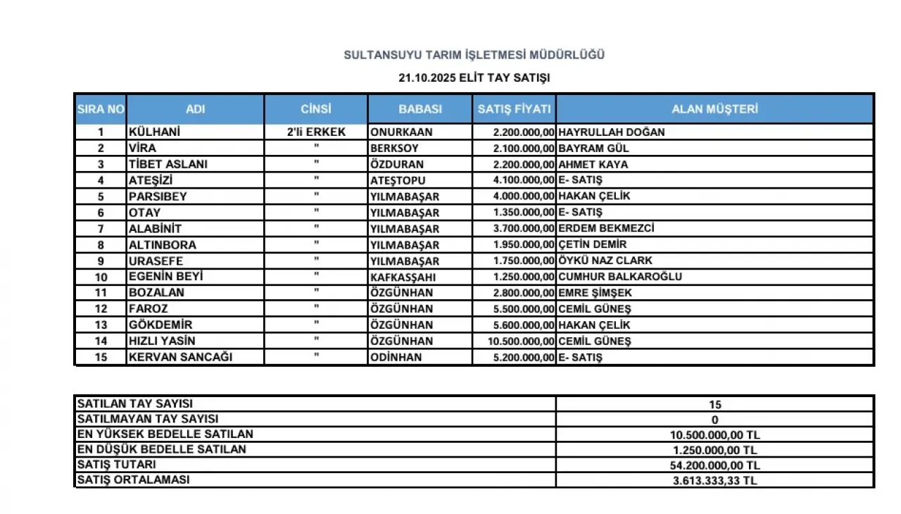 Sultansuyu Tarım İşletmesi yetkilileri tarafından yapılan açıklamada, satışların toplamda 54 milyon 200 bin lira gelir getirdiği belirtildi. Açıklamaya göre en düşük fiyata satılan tay, 1 milyon 250 bin lira ile Ege’nin Beyi olurken, listenin ikinci sırasında yer alan Faroz isimli tay 5 milyon 500 bin liraya alıcı buldu.