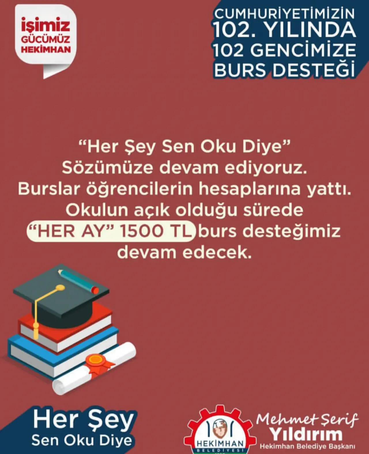 Öte yandan Hekimhan Belediyesi, sosyal belediyecilik anlayışı doğrultusunda eğitime verdiği desteği bu yıl da sürdürdü. “İşimiz Gücümüz Hekimhan” başlığıyla yapılan paylaşımda, Cumhuriyet’in 102. yılı dolayısıyla Hekimhan’da eğitim gören 102 gence burs desteği sağlandığı kamuoyuna duyuruldu. Her yıl düzenli olarak verilen burs desteğinin bu yıl aylık 1.500 TL olarak belirlendiği açıklandı.