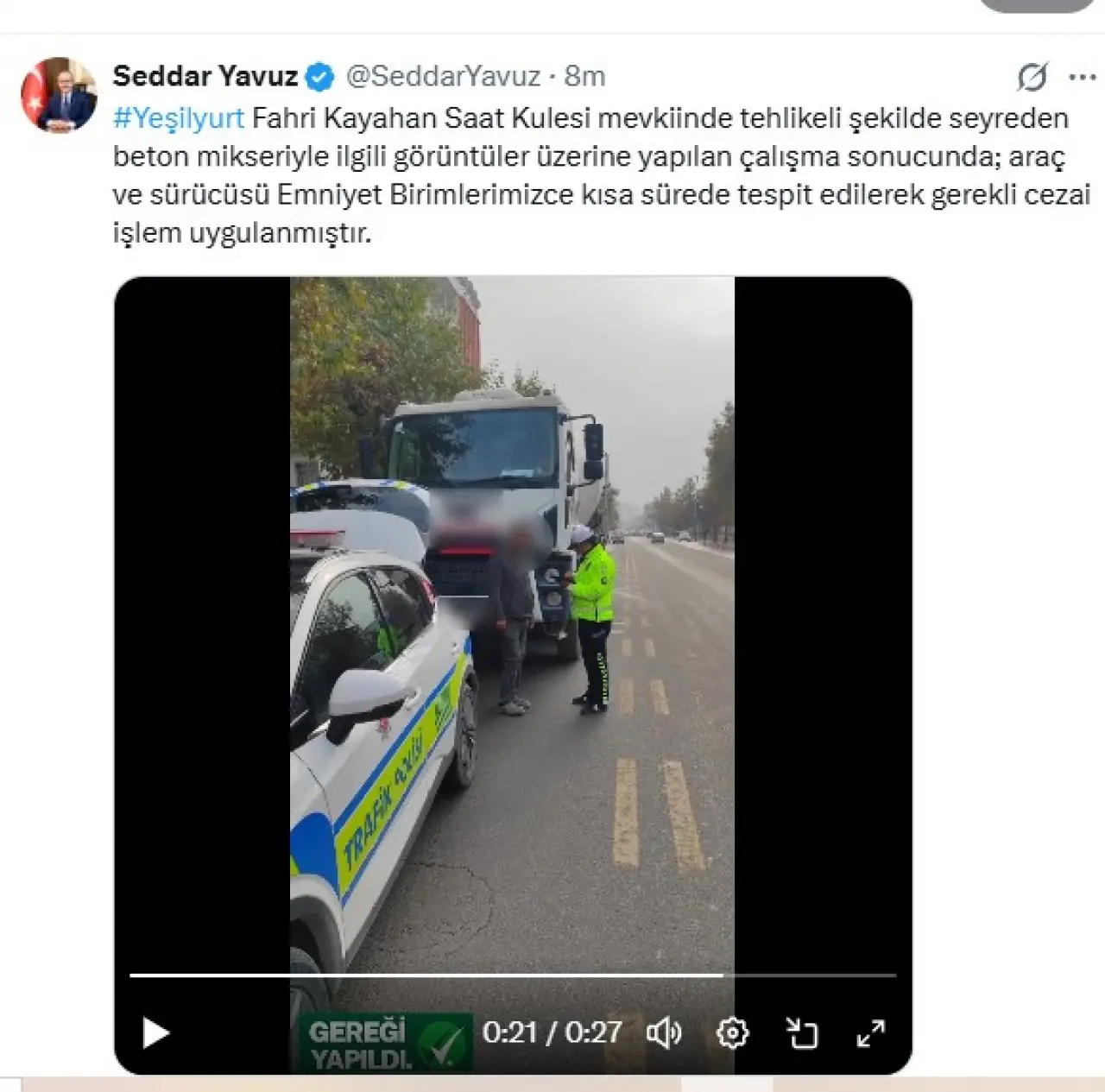 “Yeşilyurt Fahri Kayahan Saat Kulesi mevkiinde tehlikeli şekilde seyreden beton mikseriyle ilgili görüntüler üzerine yapılan çalışma sonucunda; araç ve sürücüsü Emniyet Birimlerimizce kısa sürede tespit edilerek gerekli cezai işlem uygulanmıştır.”
