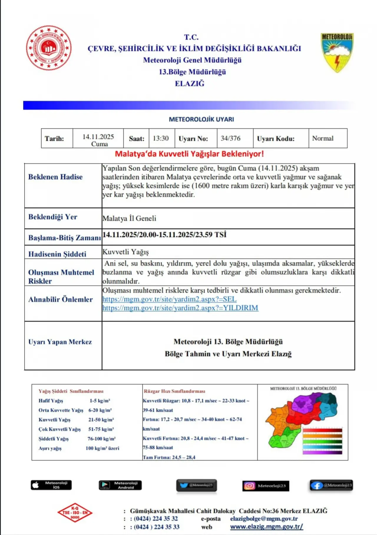 Meteoroloji Genel Müdürlüğü 13. Bölge Müdürlüğü, Malatya için kuvvetli yağış uyarısında bulundu. Yapılan son değerlendirmelere göre bugün (14 Kasım 2025 Cuma) saat 20.00’den itibaren şehir genelinde etkili olacak yağışların, yer yer kuvvetli yağmur ve sağanak şeklinde görülmesi bekleniyor.