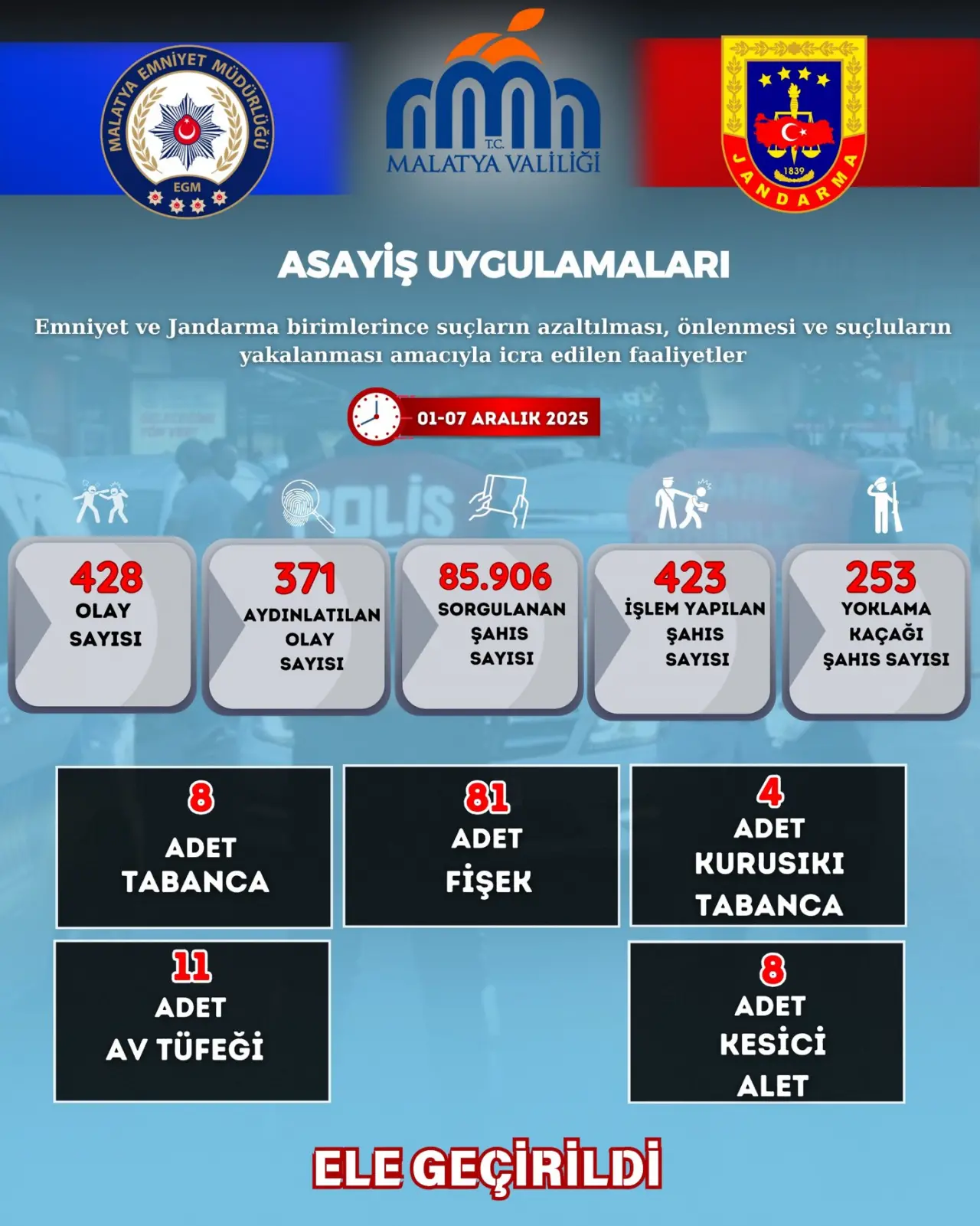 Malatya Valiliği’nin açıkladığı haftalık rapor, kentte güvenlik güçlerinin yoğun ve sistemli bir çalışma yürüttüğünü gösteriyor. Rapora göre emniyet ve jandarma birimleri 1–7 Aralık haftasında: