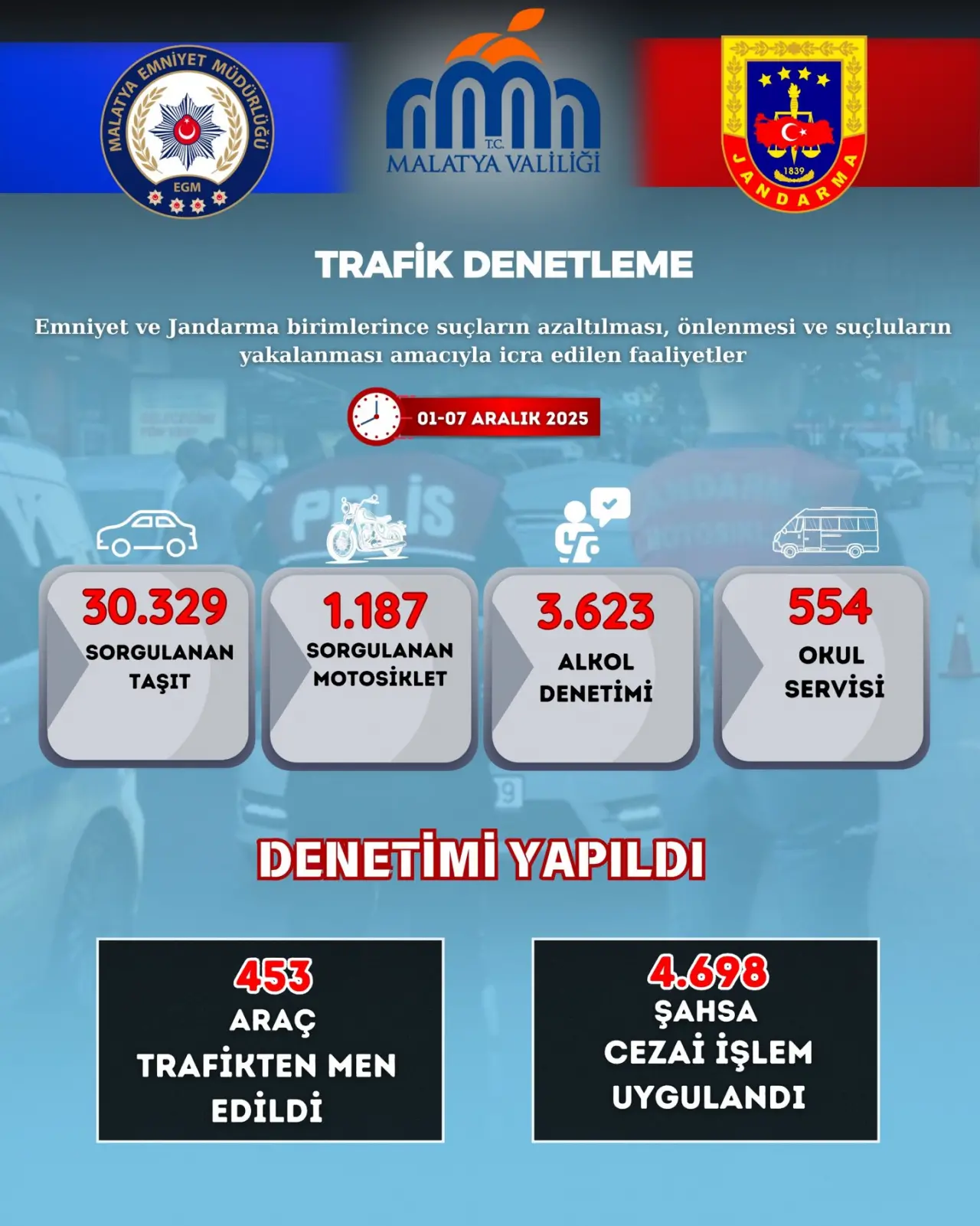 30.329 araç sorgulandı, 453 araç trafikten men edildi, 4.698 sürücüye ceza uygulandı. Alkollü araç kullanımı, yüksek hız, ehliyetsiz sürücüler, teknik eksikliği bulunan araçlar ve kış lastiği zorunluluğuna uymayanlar denetimlerin odağında yer aldı. Kentin giriş çıkış noktalarında kurulan uygulama noktalarında şüpheli araçlar ve yük taşımacılığı da mercek altına alındı.